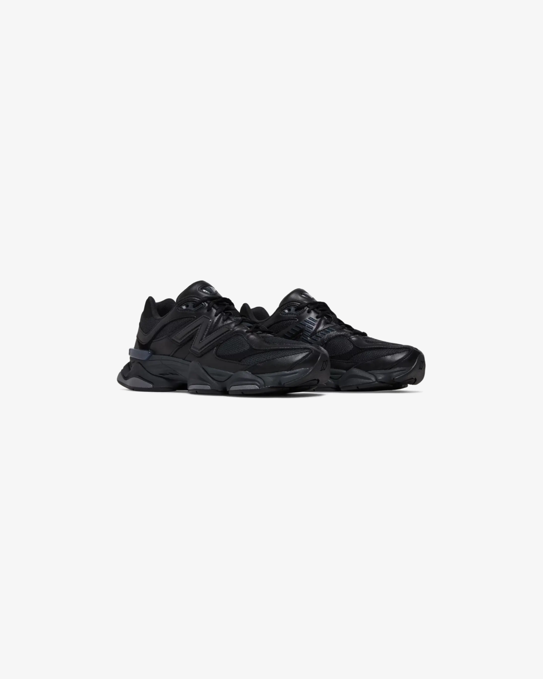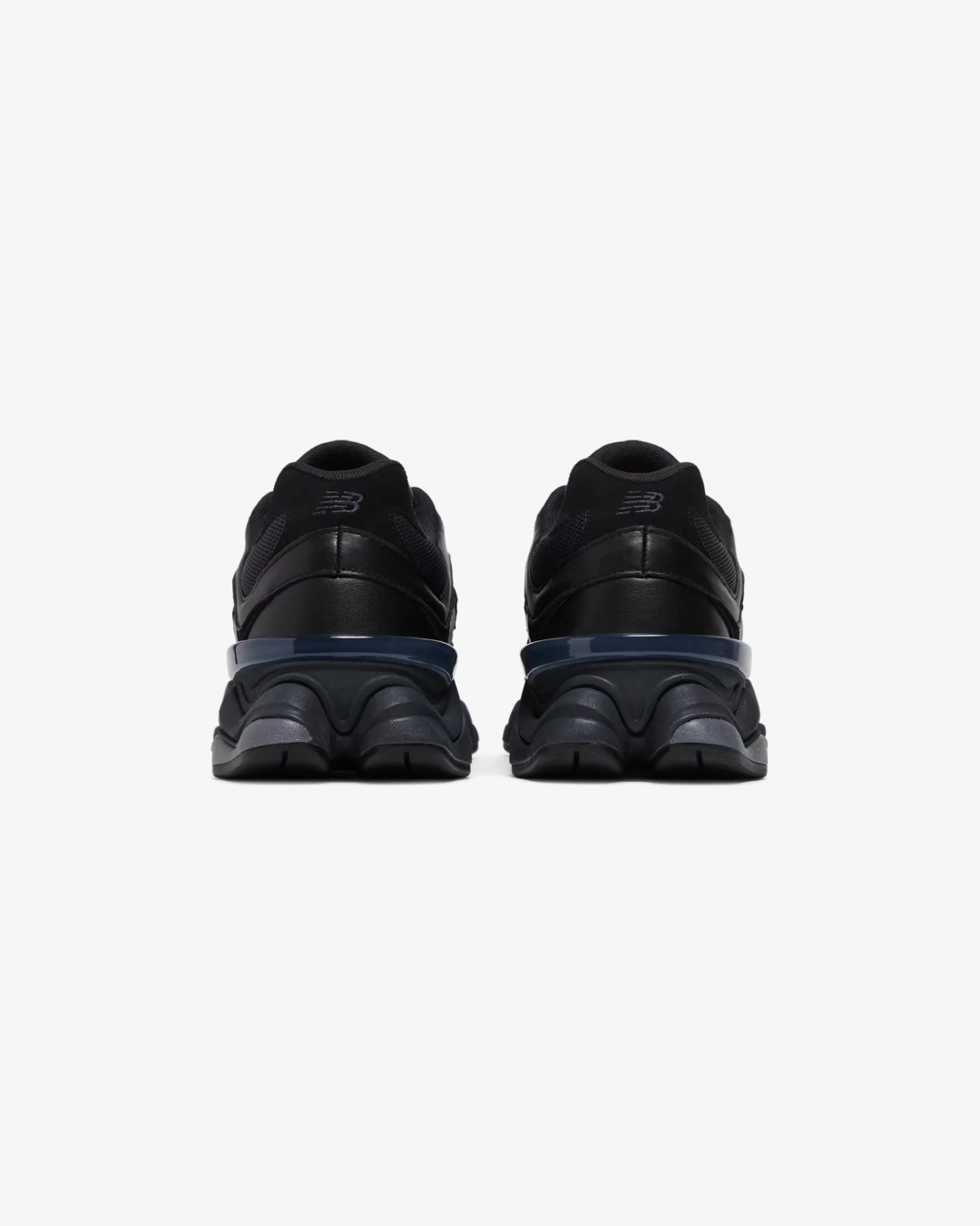 The New Balance 9060 Triple Black Leather Sneakers features a breathable mesh base with durable suede overlays. Glossy patent leather detailing is utilized on the forefoot overlay, lateral 'N' logo and back tab, marked with embroidered NB branding.