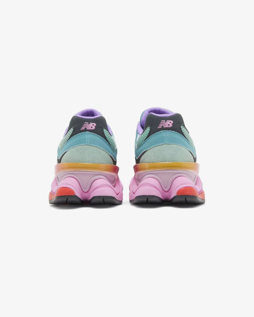 The New Balance 9060 ‘Warped’ features purple textile lines on the upper, crafted from mint-colored mesh with tonal leather and suede overlays. An ‘N’ logo in yellow and orange decorates the sneaker’s lateral side, while the opposite side features a stylized ‘N’ in red and yellow embroidery.
