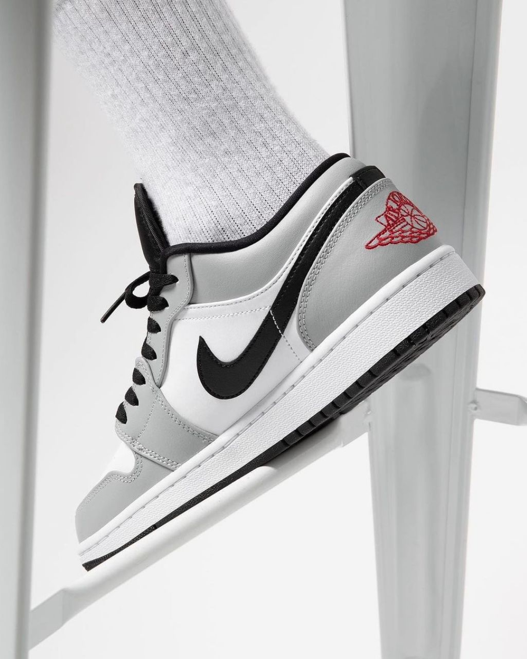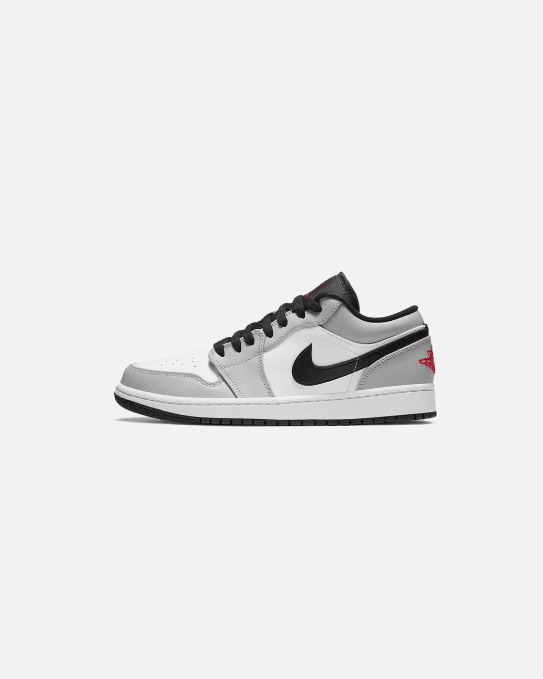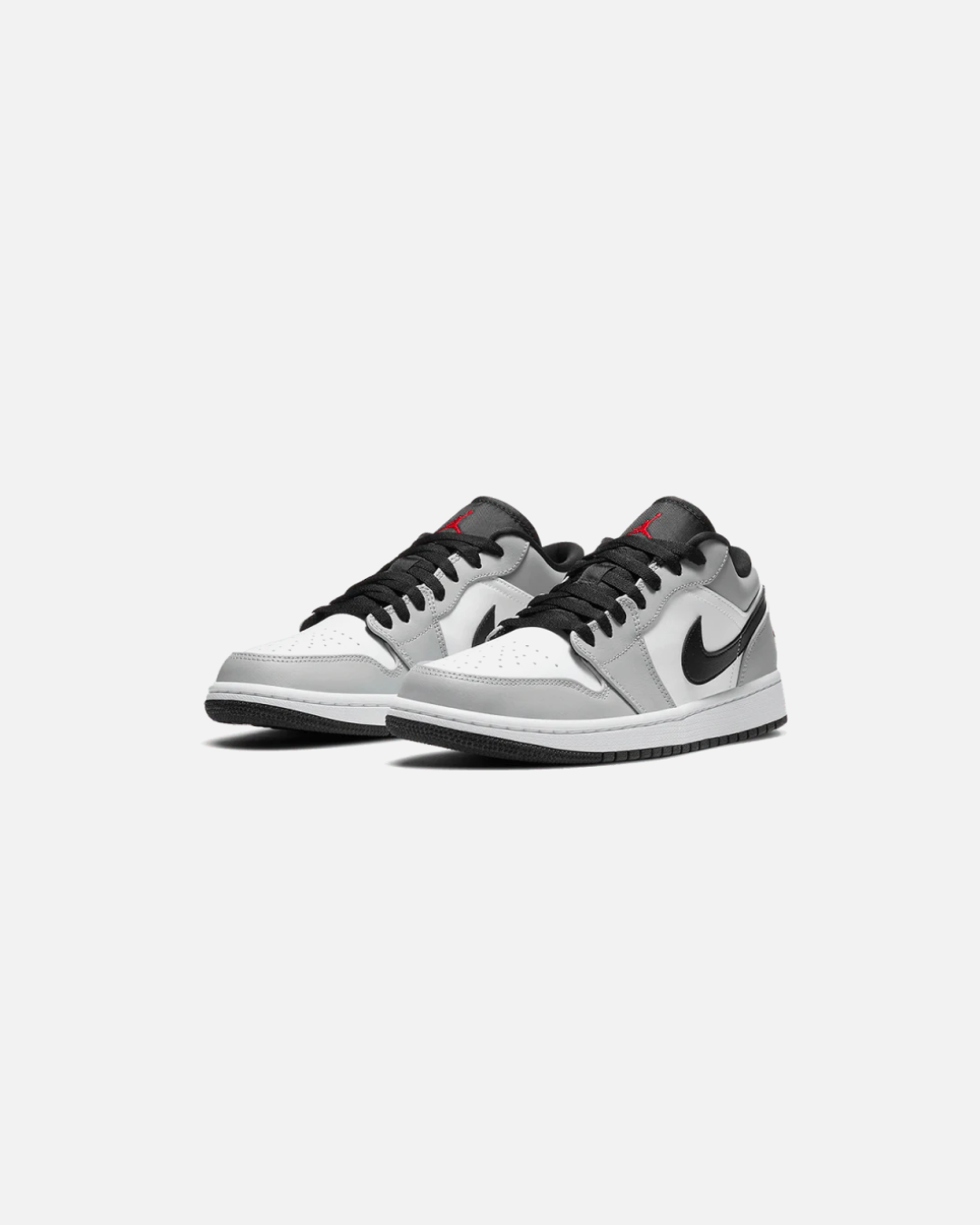 The white leather top of the Air Jordan 1 Low Light Smoke grey is covered in grey around the toe and heel. These trainers have a unique appearance thanks to the black laces, lining, tongue and Swooshes. The accompanying features of the design feature dramatic pops of red, black, and white. This classic style is finished with a black outsole and white midsole.