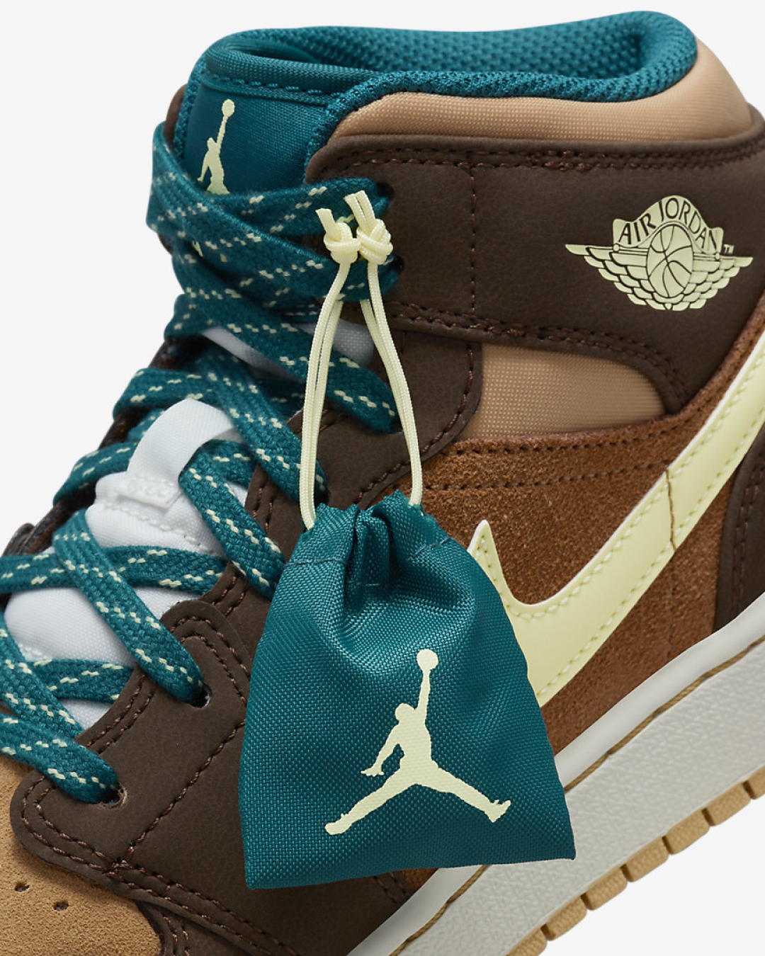 It features two tones of brown seen on the base and overlays, while hints of luminous green appear on the Swooshes and Jordan Wings logos. Highlighting the release are white tongues and geode teal laces, a special baggy hang tag, along with teal-colored sock liners.