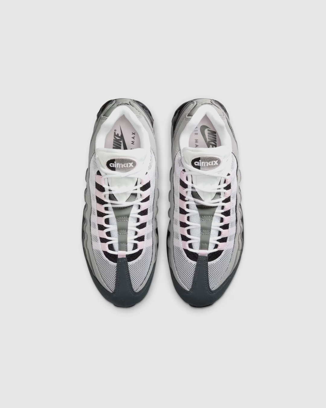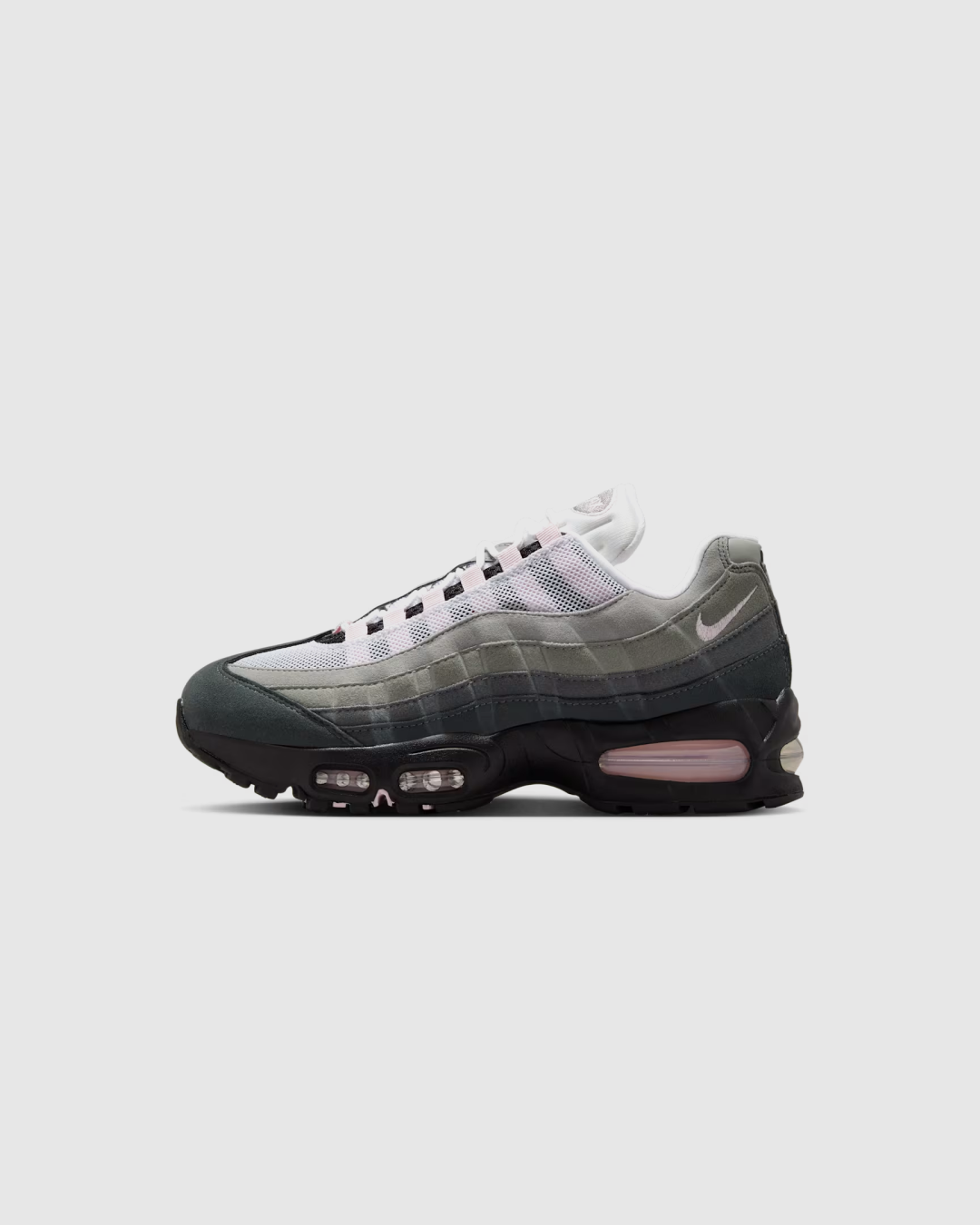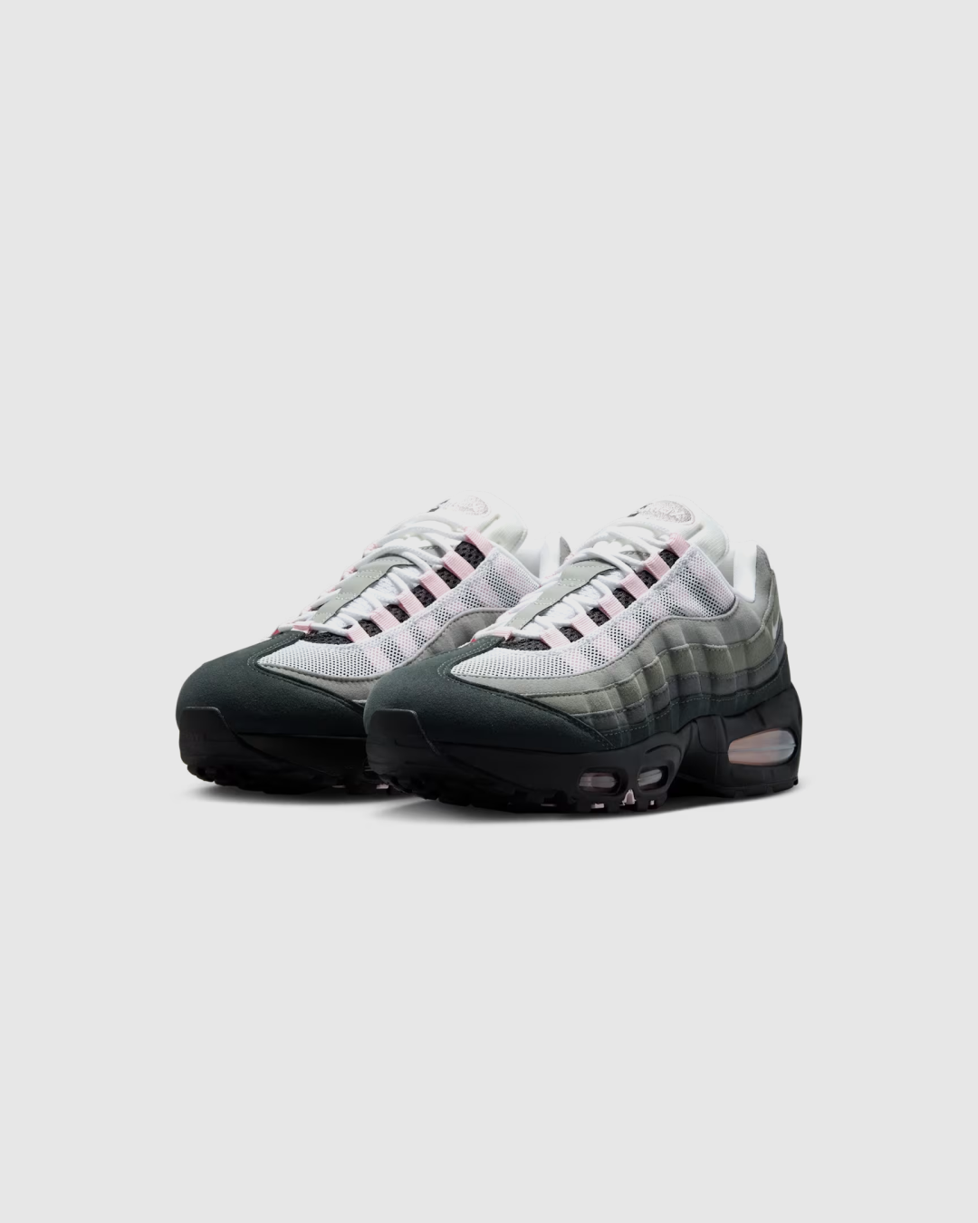 The Nike Air Max 95 OG “Pink Foam” reimagines a timeless silhouette with a fresh, feminine twist. Inspired by human anatomy and trail running heritage, this pair features the classic layered upper in soft gradient tones of white, grey, and blush pink, accented with mesh paneling and premium suede overlays. The visible Air units in the heel and forefoot deliver responsive cushioning and unmistakable 90s appeal. With its bold shape and nostalgic DNA, the Pink Foam colorway adds just the right dose of softness to a streetwear staple.