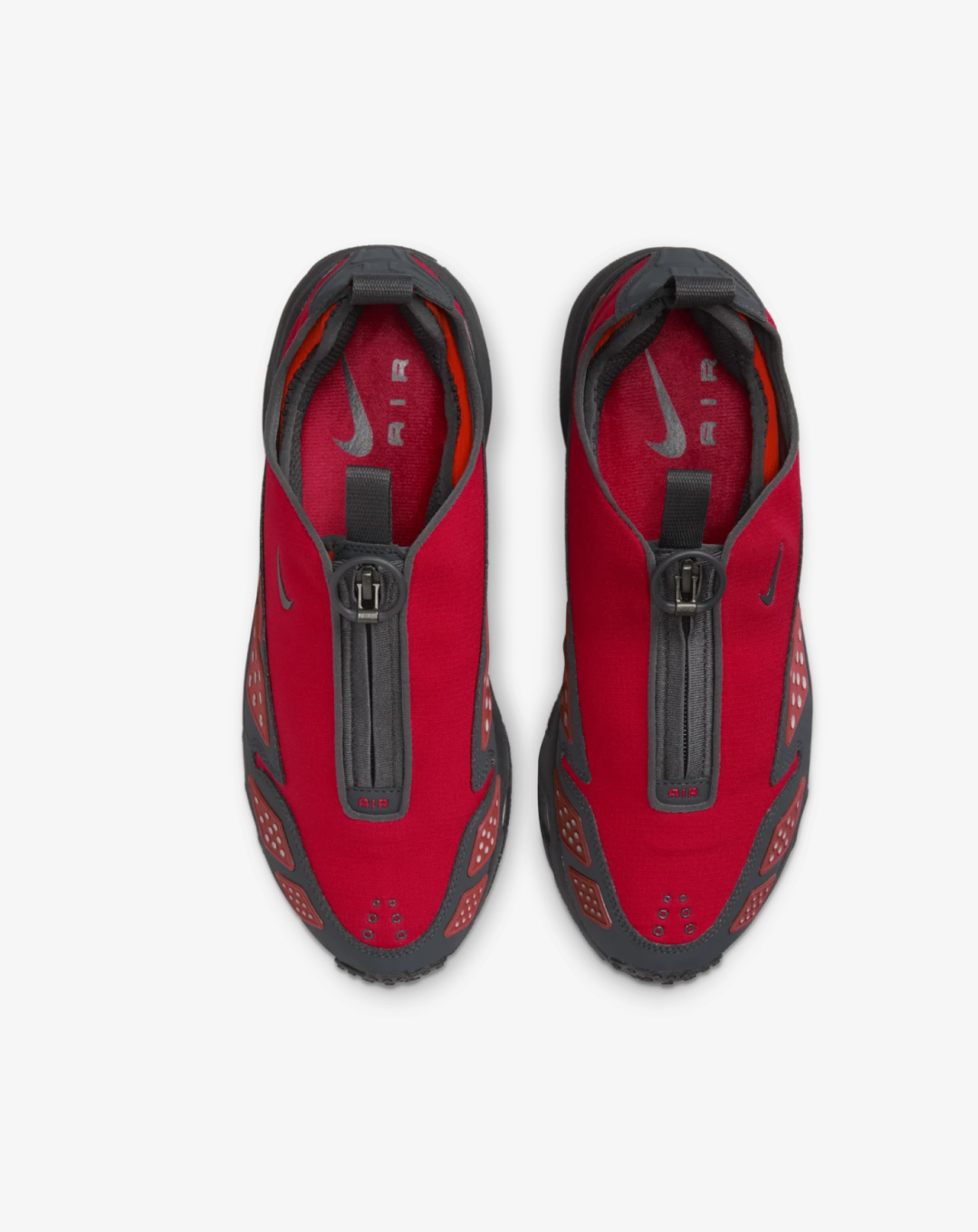 The Nike Air Max SNDR GORE-TEX 'Dark Smoke Grey and Fire Red' sneakers combine futuristic design with all-weather functionality. Inspired by the early 2000s Nike Air Sunder Max, this modern reinterpretation features a waterproof GORE-TEX upper in dark smoke grey, ensuring protection against the elements while maintaining breathability. The zippered shroud closure gives the shoe a sleek, streamlined appearance, while fire red accents on the midsole and pull tabs add a bold contrast. Underfoot, the full-length Air unit provides responsive cushioning, while the rugged rubber outsole delivers traction on various surfaces.