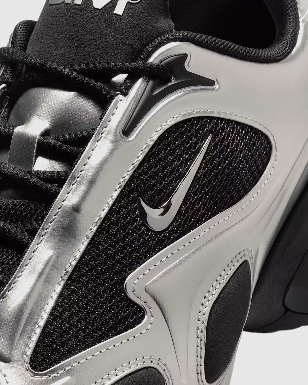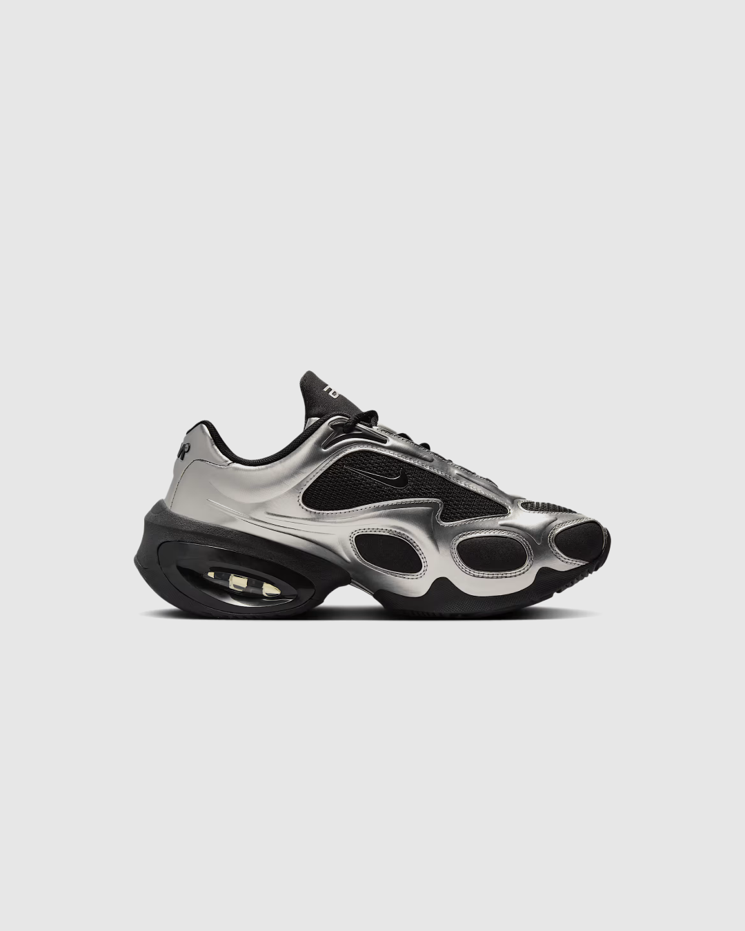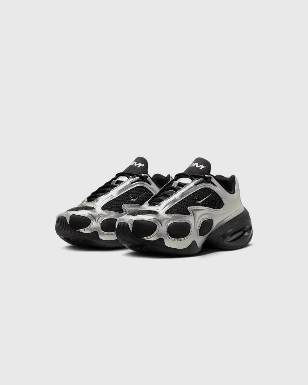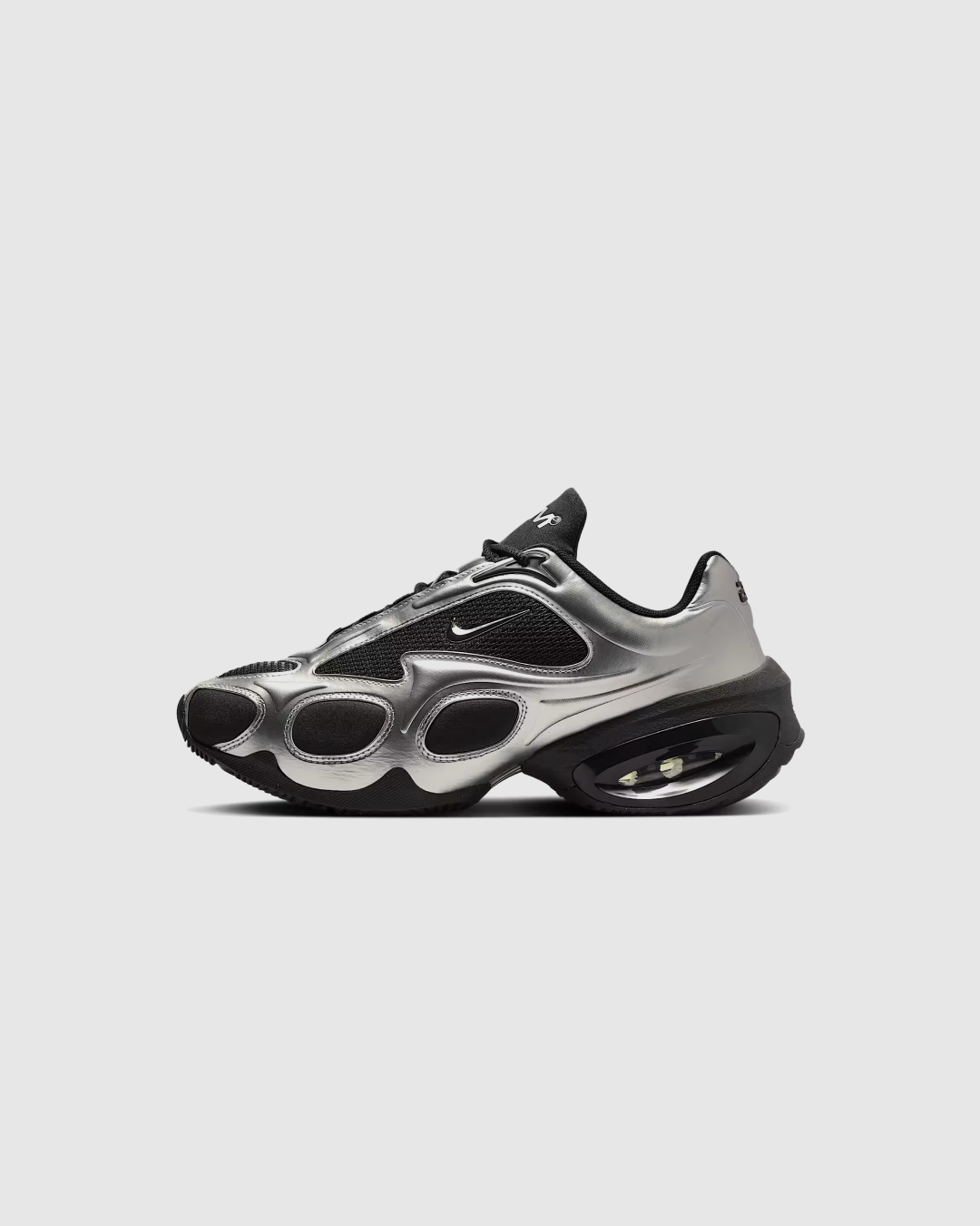 The Nike Air Max Muse “Black/Metallic Silver” is a bold, women’s-exclusive silhouette that reimagines the Air Max lineage with futuristic design and innovative cushioning. Released globally on January 10, 2025, this model features a sleek black mesh upper complemented by metallic silver synthetic leather overlays. Distinctive branding includes a glossy black mini-Swoosh on the quarter panel and embossed “AM” logos on the tongue and heel. The shoe is built with a high-arch profile, a visible Air sole unit in the heel, and a foam midsole for lightweight comfort. Designed using computational techniques, the Air Max Muse combines style and innovation, offering a distinctive look within the Air Max family.