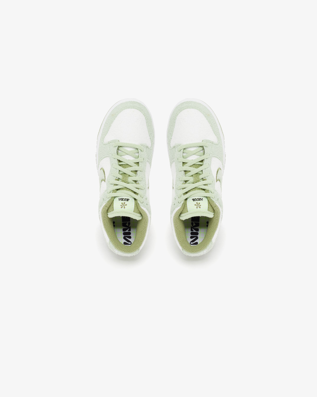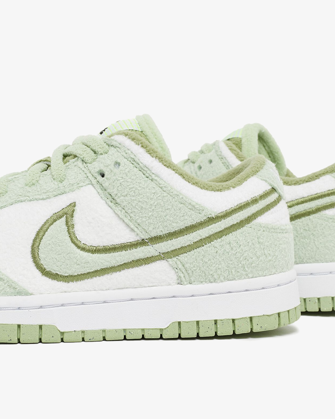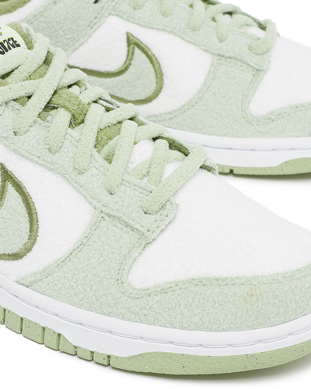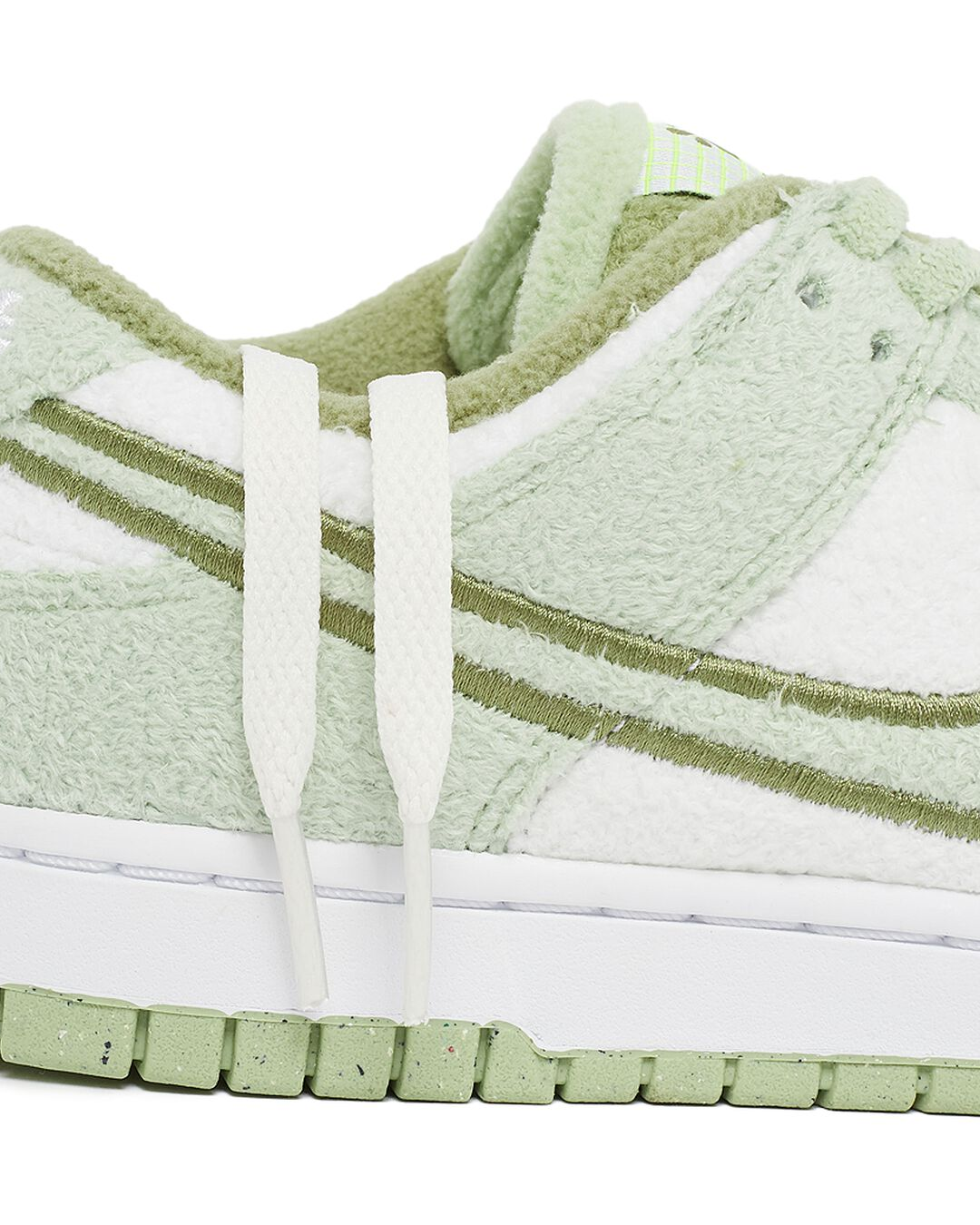 There Nike Dunk Low SE Fleece Green displays a polar material which covers the entire upper. Of the Melon green panels associate with the white parts. The latter agree perfectly with the tongue laces. The whole set is based on a white sole to the outsole in Nike Grind.