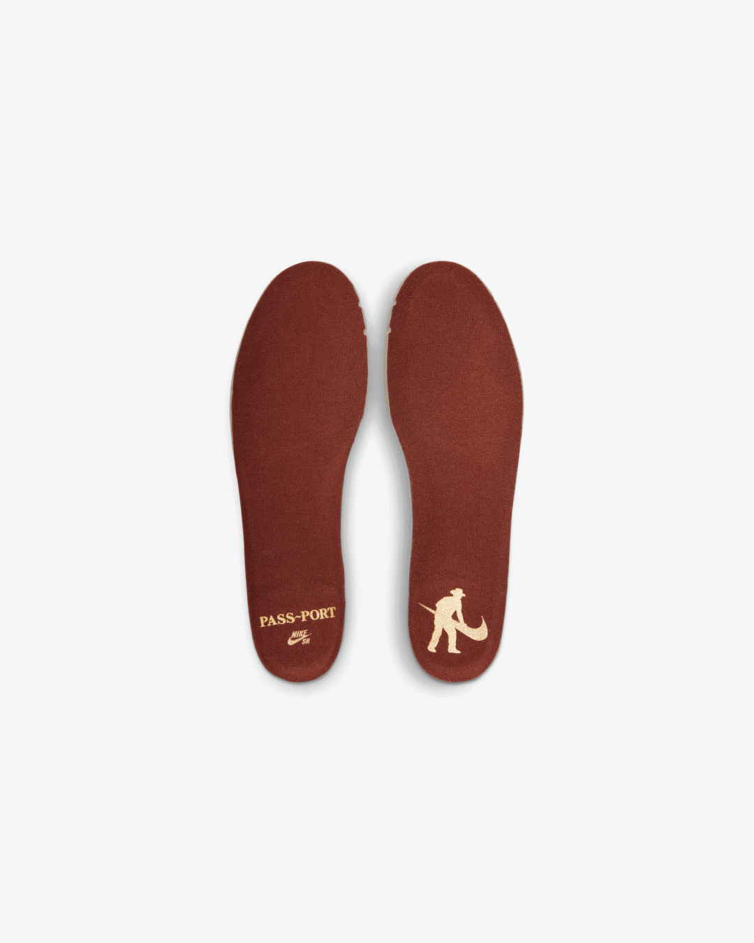 On the lateral side, a woven embroidered logo patch of Pass~Port's signature pickaxe logo is prominently displayed, symbolizing hard work and the brand's commitment to skateboarding. The Nike Swoosh is creatively designed with a contrasting yellow outline, giving the sneakers a striking yet harmonious look.
