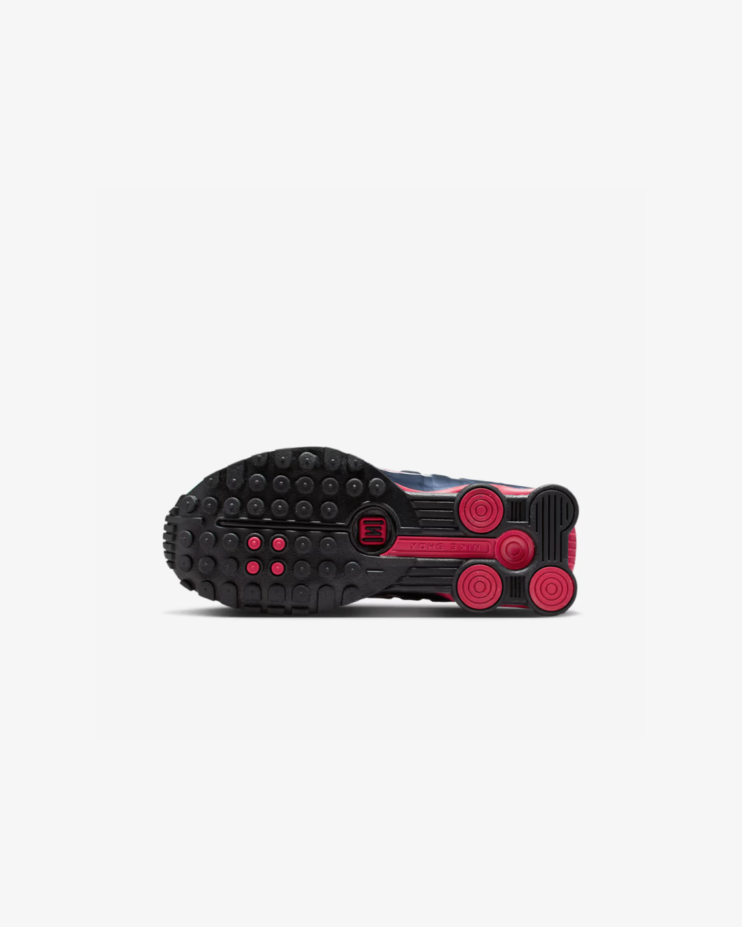 The Nike Shox R4 "Midnight Navy/White/Metallic Silver/Gym Red” Sneakers revive one of Nike’s most iconic silhouettes, fusing futuristic aesthetics with athletic heritage. Designed with a sleek synthetic leather upper in metallic silver and midnight navy, this pair delivers a bold, aerodynamic look reminiscent of early 2000s performance footwear. The signature Shox columns at the heel not only enhance cushioning but also add a distinct mechanical edge that defines the sneaker’s identity.