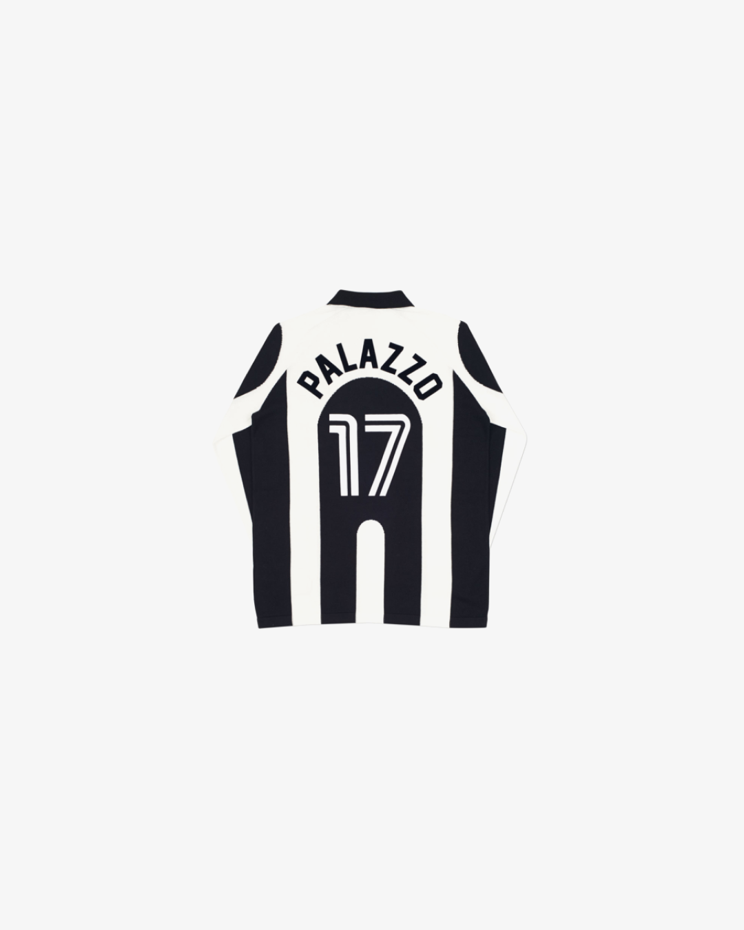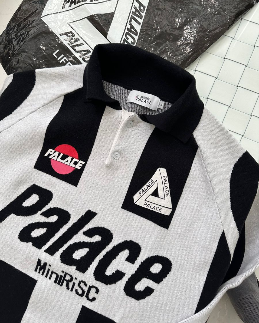 Step up your streetwear game with the Palace Logo Palazzo Knit in White/Black. This knit piece features a bold, all-over Palace logo pattern in a striking black-and-white colorway, offering a statement look that's both modern and versatile.