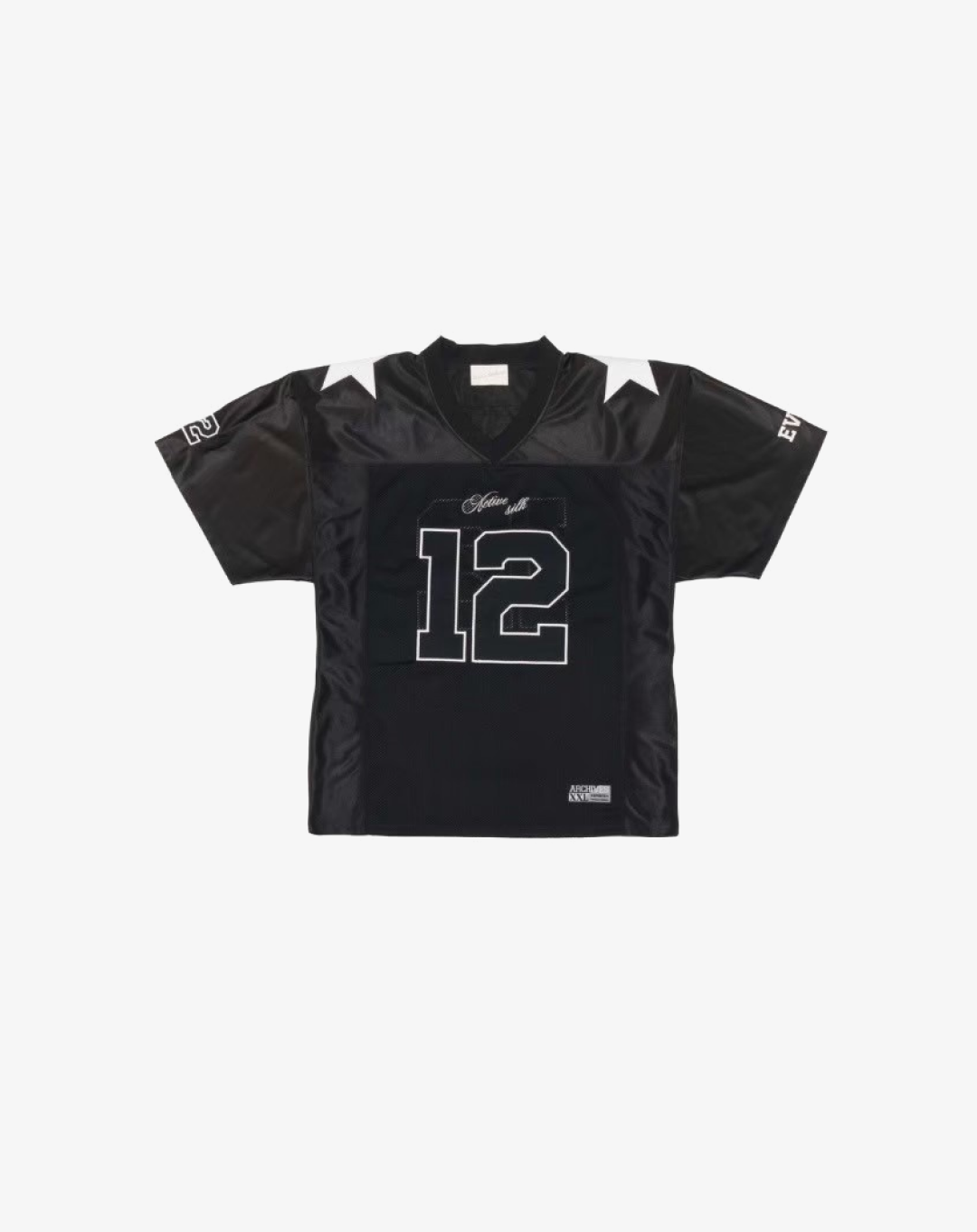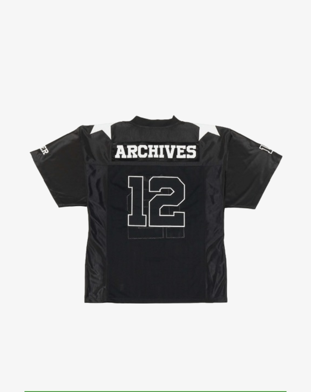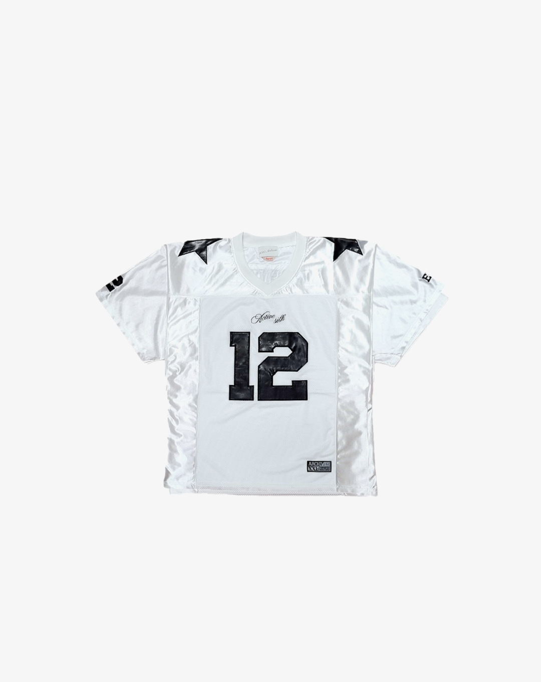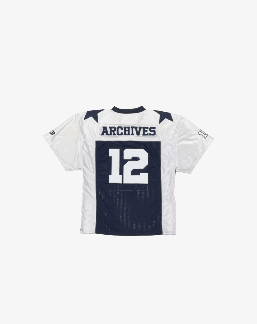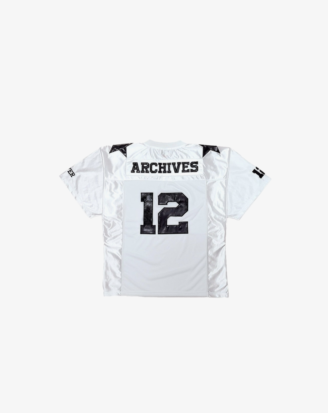 The 2000 Archives Football T-Shirts are a distinctive blend of vintage aesthetics and contemporary fashion, drawing inspiration from classic football jerseys. Crafted from polyester jersey fabric, these shirts feature a V-neckline and mesh panels on both sides, ensuring breathability and comfort. The embroidered number '12' on the front and back, along with the 'ARCHIVES' logo applique on the rear, adds to their unique charm. The subtle sheen of the satin jersey fabric and the star appliques on the shoulders further enhance their standout design. Designed with a unisex fit, these t-shirts cater to a wide range of styles and preferences.