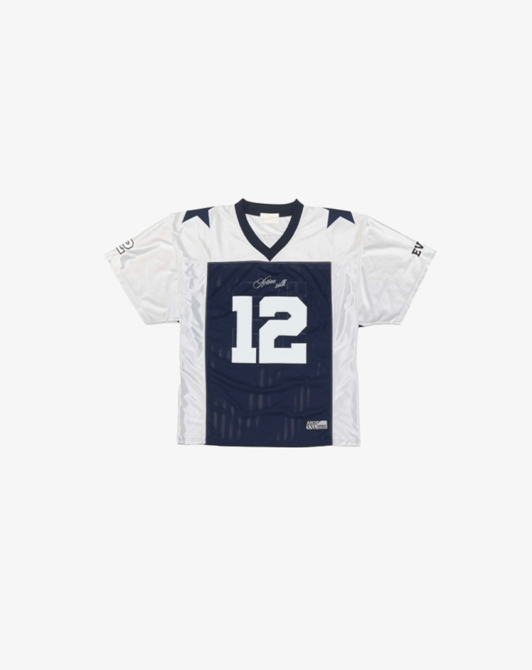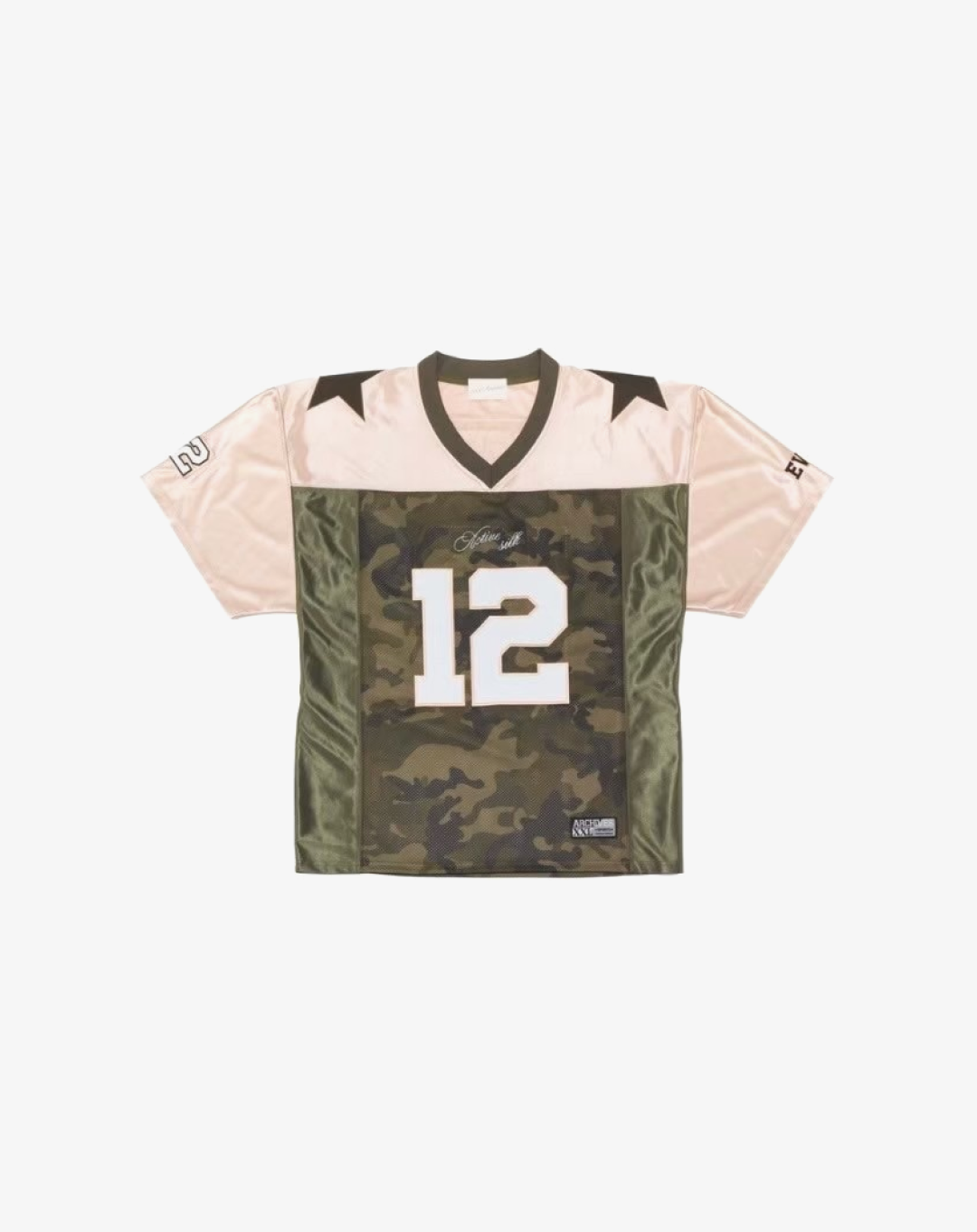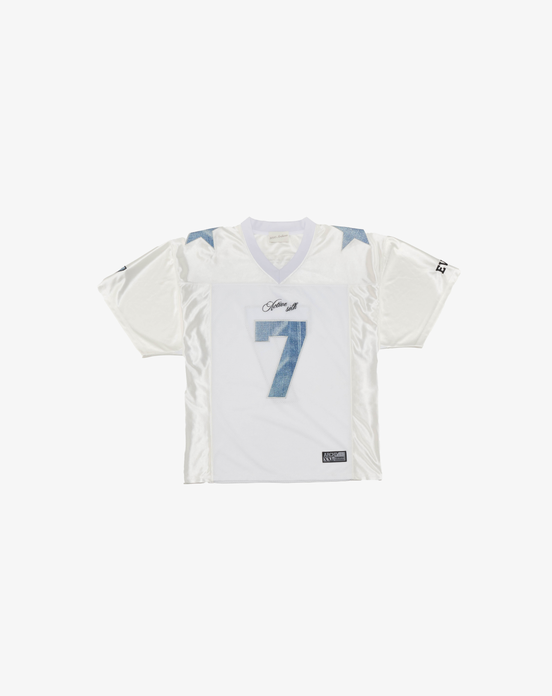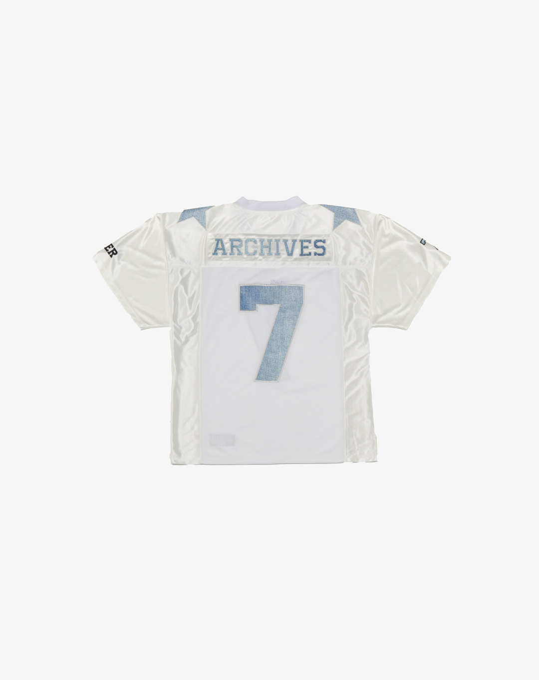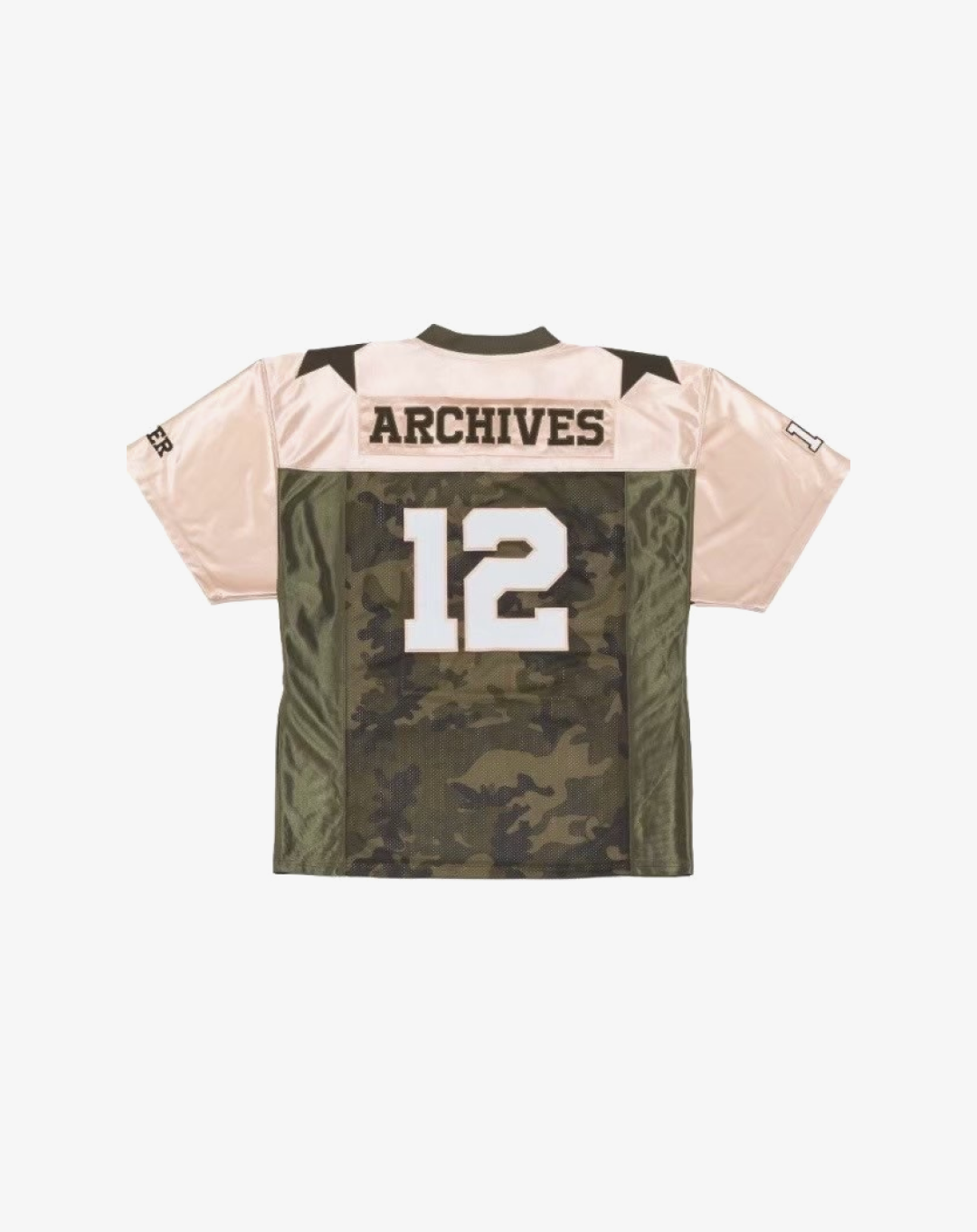 The 2000 Archives Football T-Shirts are a distinctive blend of vintage aesthetics and contemporary fashion, drawing inspiration from classic football jerseys. Crafted from polyester jersey fabric, these shirts feature a V-neckline and mesh panels on both sides, ensuring breathability and comfort. The embroidered number '12' on the front and back, along with the 'ARCHIVES' logo applique on the rear, adds to their unique charm. The subtle sheen of the satin jersey fabric and the star appliques on the shoulders further enhance their standout design. Designed with a unisex fit, these t-shirts cater to a wide range of styles and preferences.
