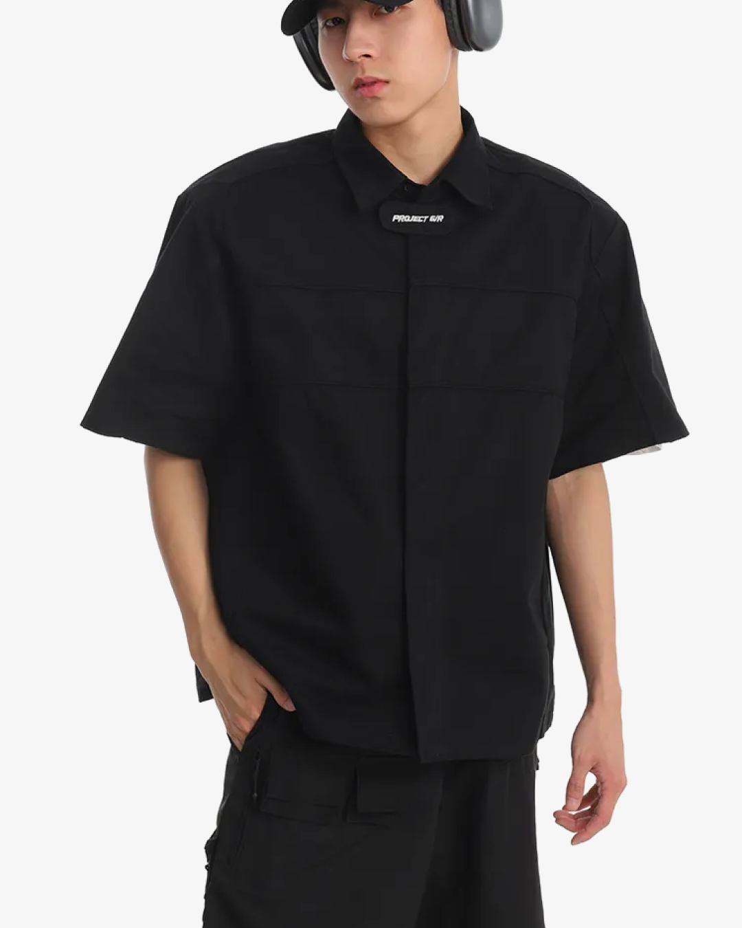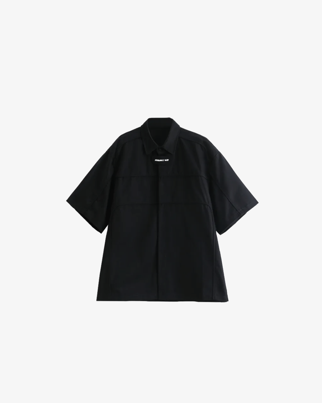 Its solid black color serves as a wardrobe staple, effortlessly pairing with jeans, tailored pants, or even layered under jackets. The Project G/F logo is subtly embroidered for a refined, brand-conscious touch, adding to the overall sophistication of this classic shirt.
