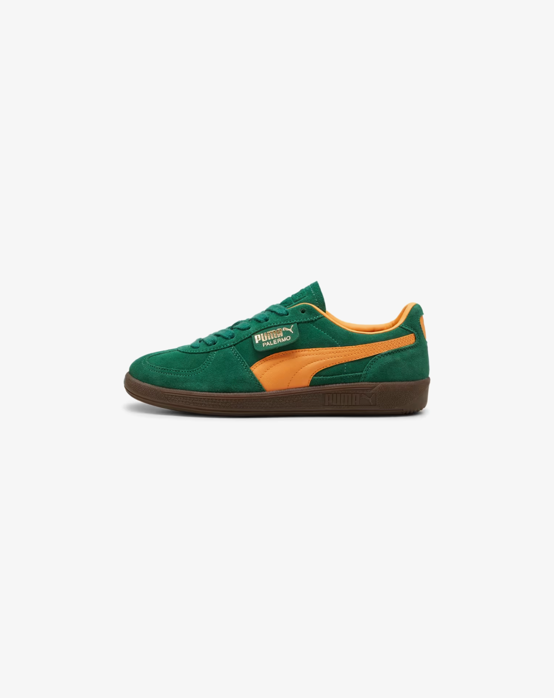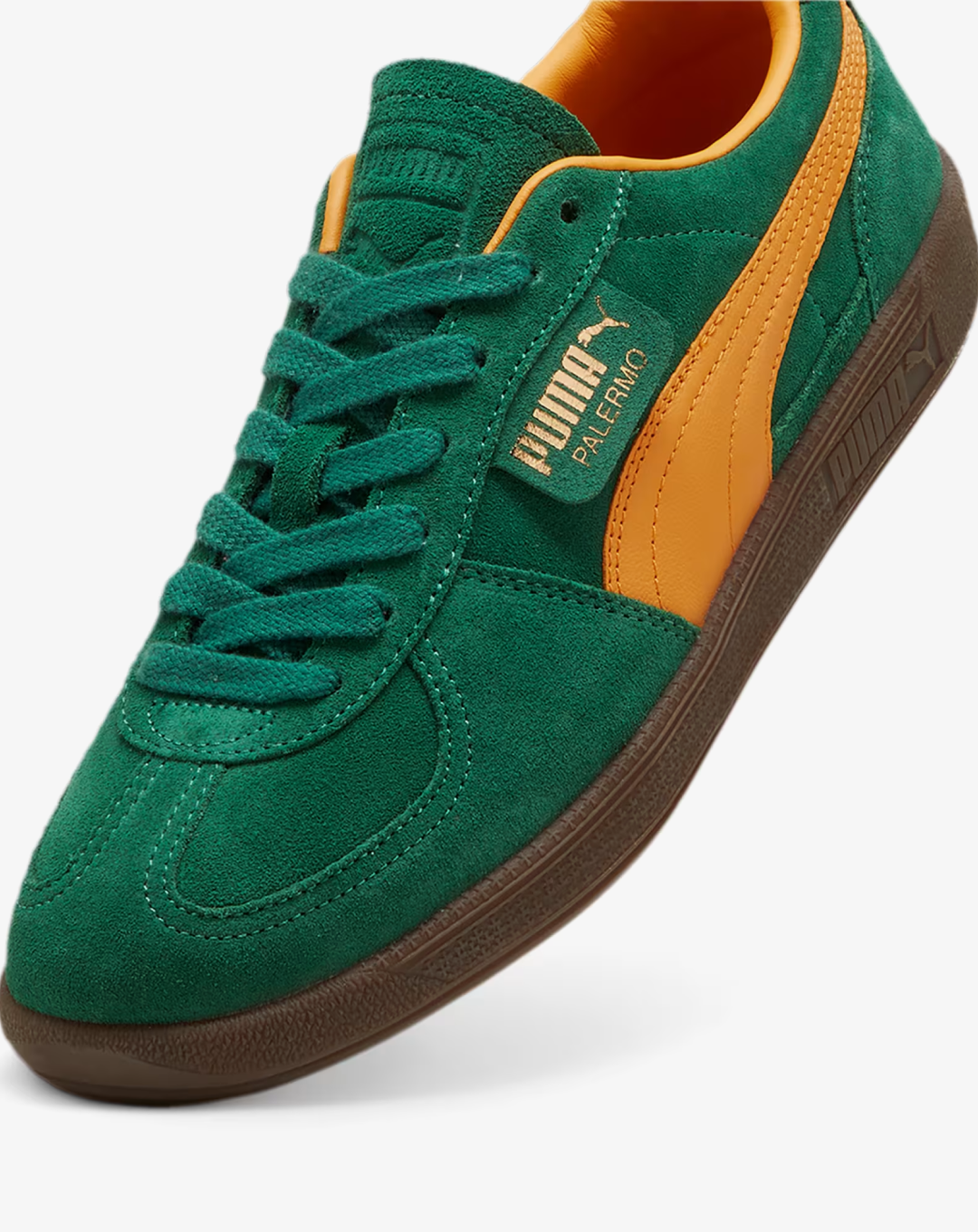 The Puma Palermo is a retro-inspired sneaker that brings vintage football heritage to everyday street style. Known for its sleek design and comfort, the Palermo model, in this striking Vine-Clementine-Mustard Green colorway, makes a bold fashion statement.