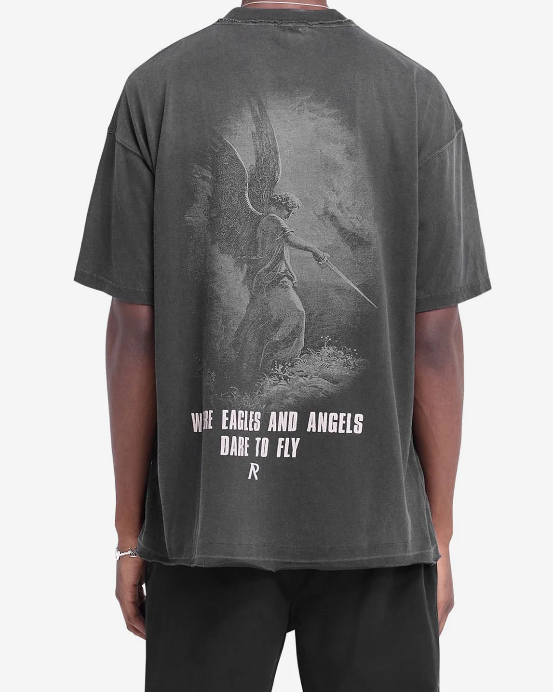 The “Godspeed” graphic print takes center stage on the back, infusing the design with spiritual edge and contemporary rebellion—a signature of Represent’s DNA. On the front, minimalist branding at the chest keeps things grounded while maintaining that clean, directional look. Every detail is intentional, from the distressed accents to the washed-out hues, giving the shirt a lived-in authenticity you can’t replicate.