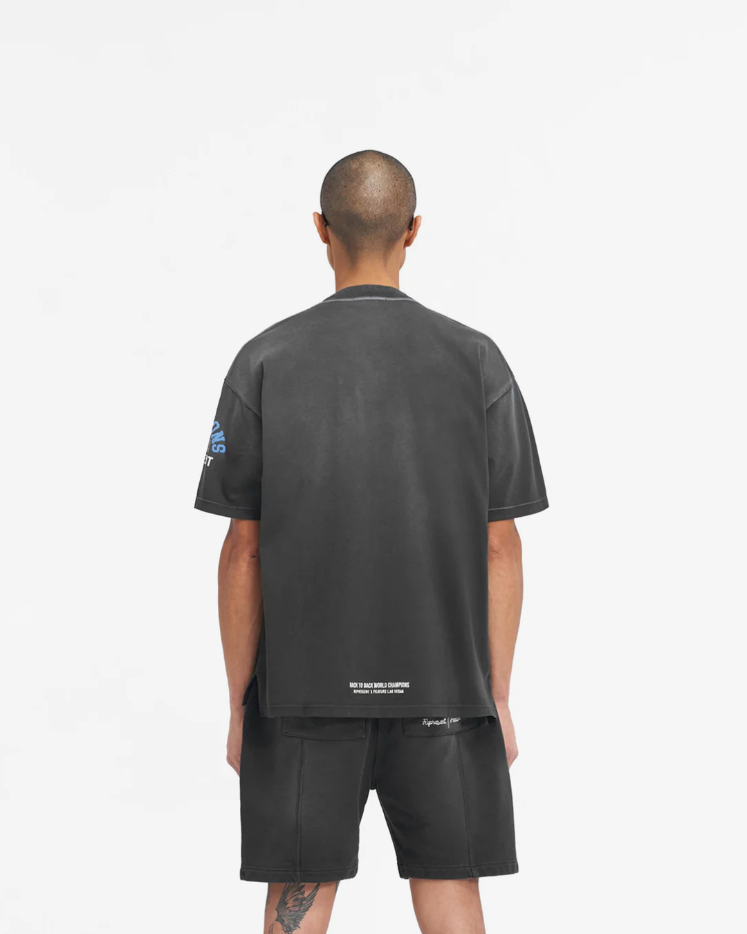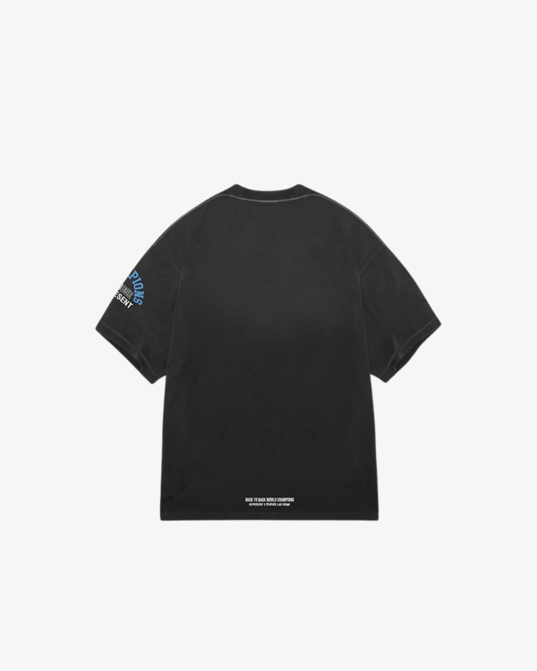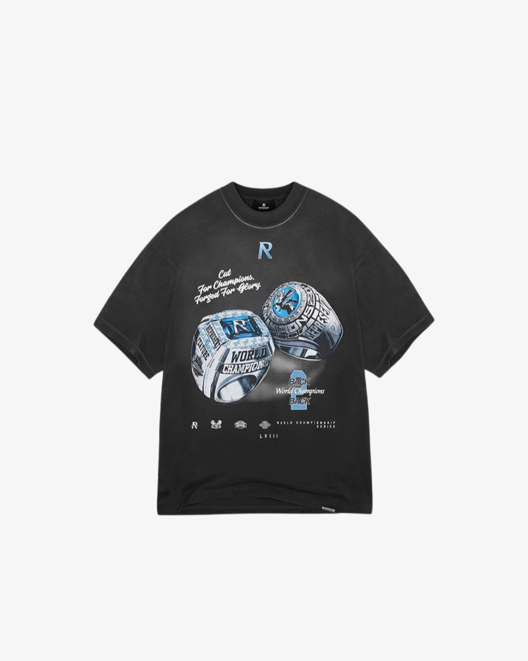 The T-shirt features a graphic design inspired by championship rings, symbolizing excellence and victory. The graphic is often bold and eye-catching, positioned prominently on the chest, adding a statement piece to any outfit.
