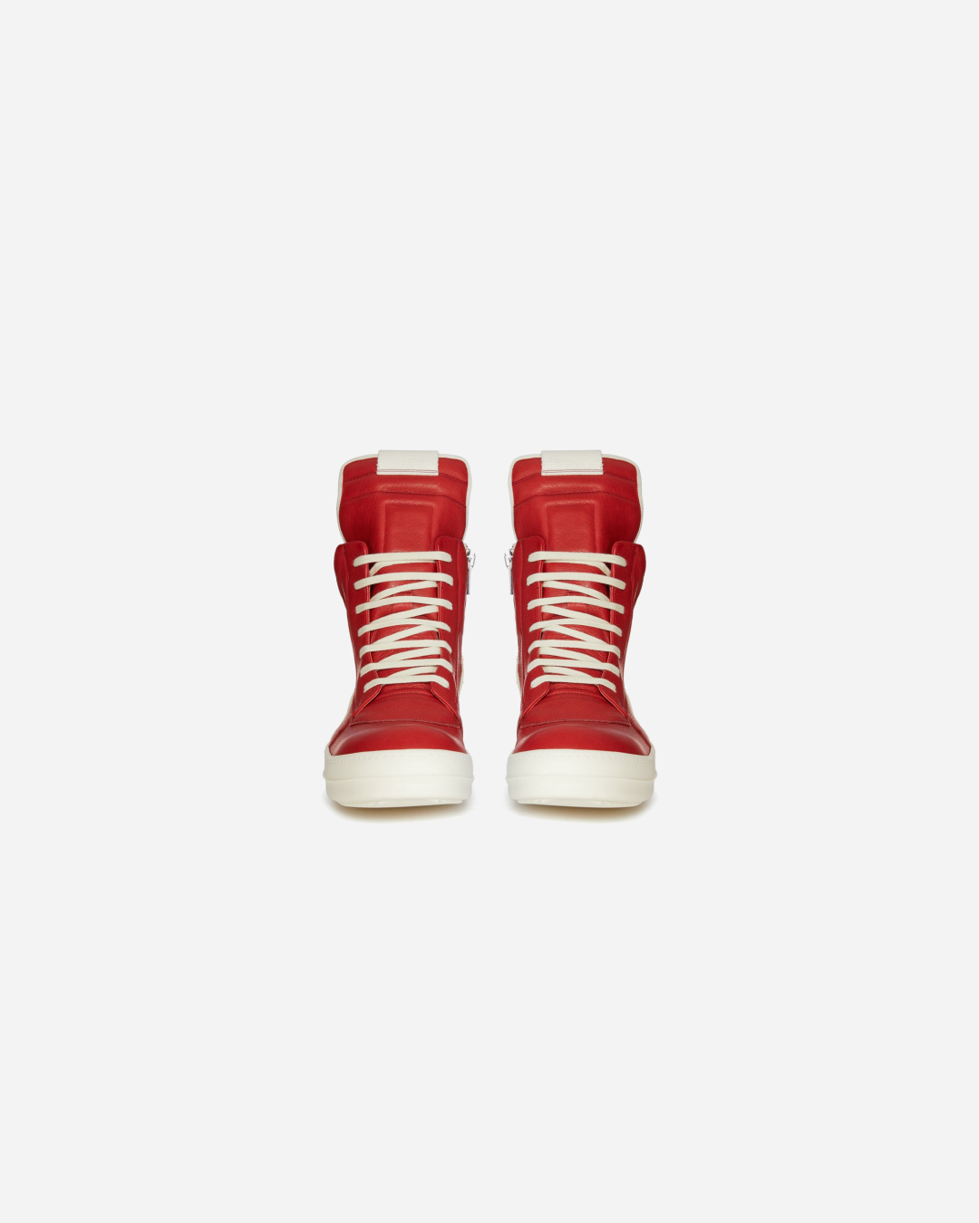 The Rick Owens Lido Geobasket High 'Cardinal Red' Milk sneakers are perfect for those looking to make a daring fashion statement with an innovative twist.