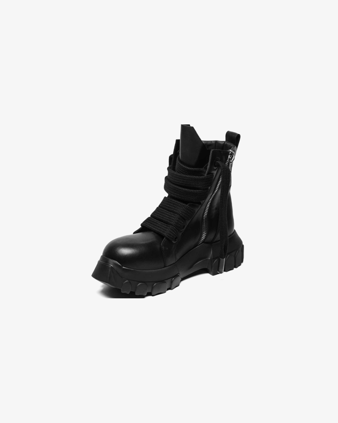 Crafted from premium leather, the boots come in a sleek black (Blacis) finish, accented by metal eyelets for a high-end industrial feel. The tractor-style platform sole is thick and textured, providing both height and durability, while adding to the boots' overall boldness. The exaggerated design balances function and fashion, making these boots a standout for anyone looking to make a powerful fashion statement.