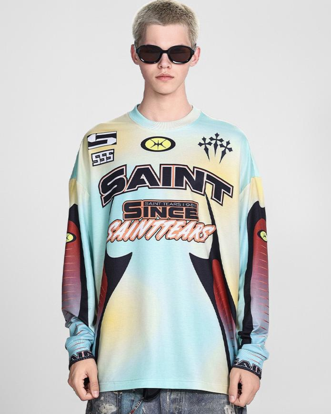 The "Saint Tears" branding or design is likely to include bold or subtle graphic elements, often reflecting emotional or introspective themes, with tear or saintly motifs incorporated. These shirts may also come in muted or monochrome colorways to enhance their understated, yet impactful aesthetic. Pair it with denim, joggers, or layered under a jacket for a fashionable, laid-back look with a touch of edge and meaning