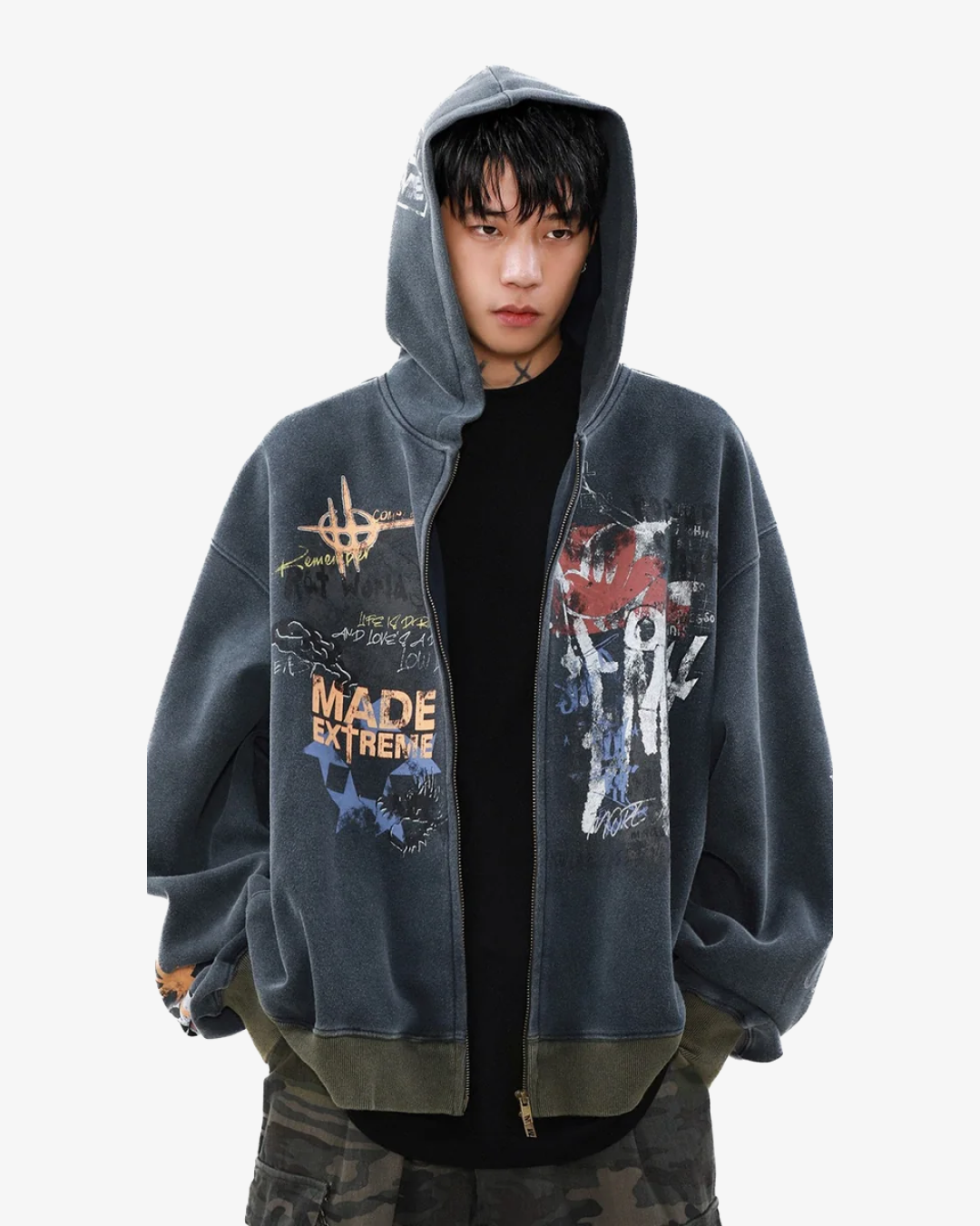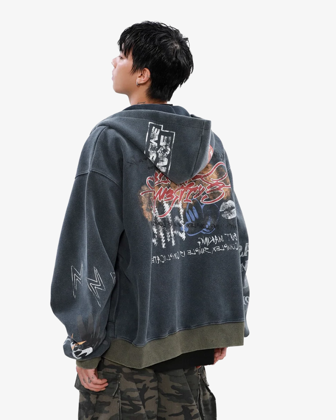 The Street Graffiti Print Loose Zip-up Hoodie brings urban art to fashion, offering a bold streetwear aesthetic. The hoodie is covered in vibrant graffiti-inspired prints, showcasing a mix of eye-catching colors, abstract shapes, and rebellious text that encapsulates the essence of street culture.