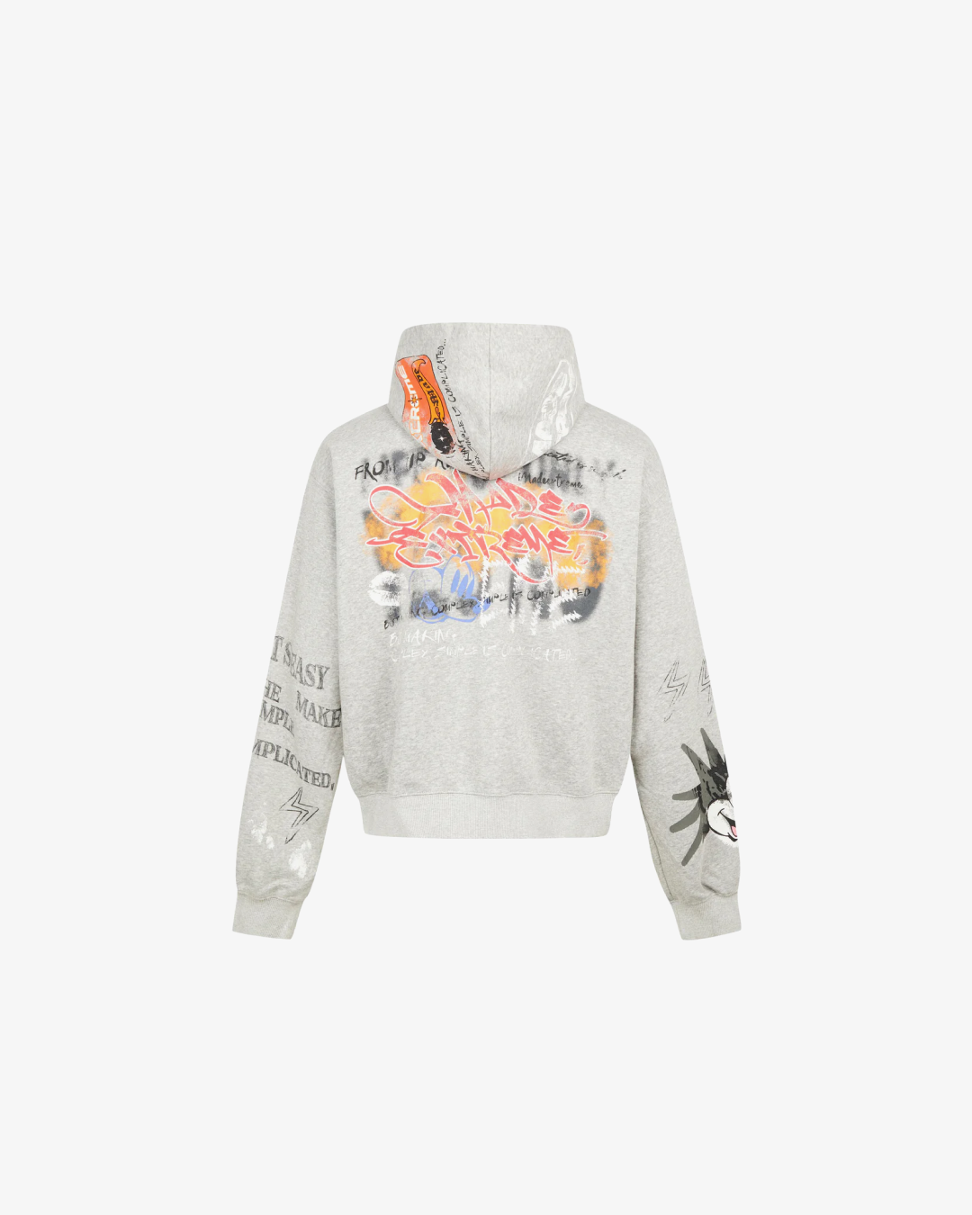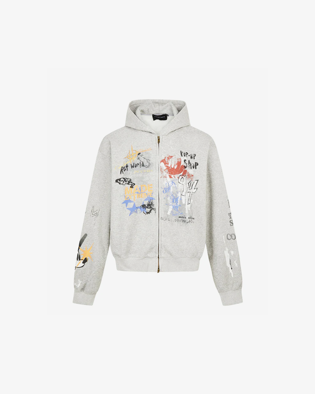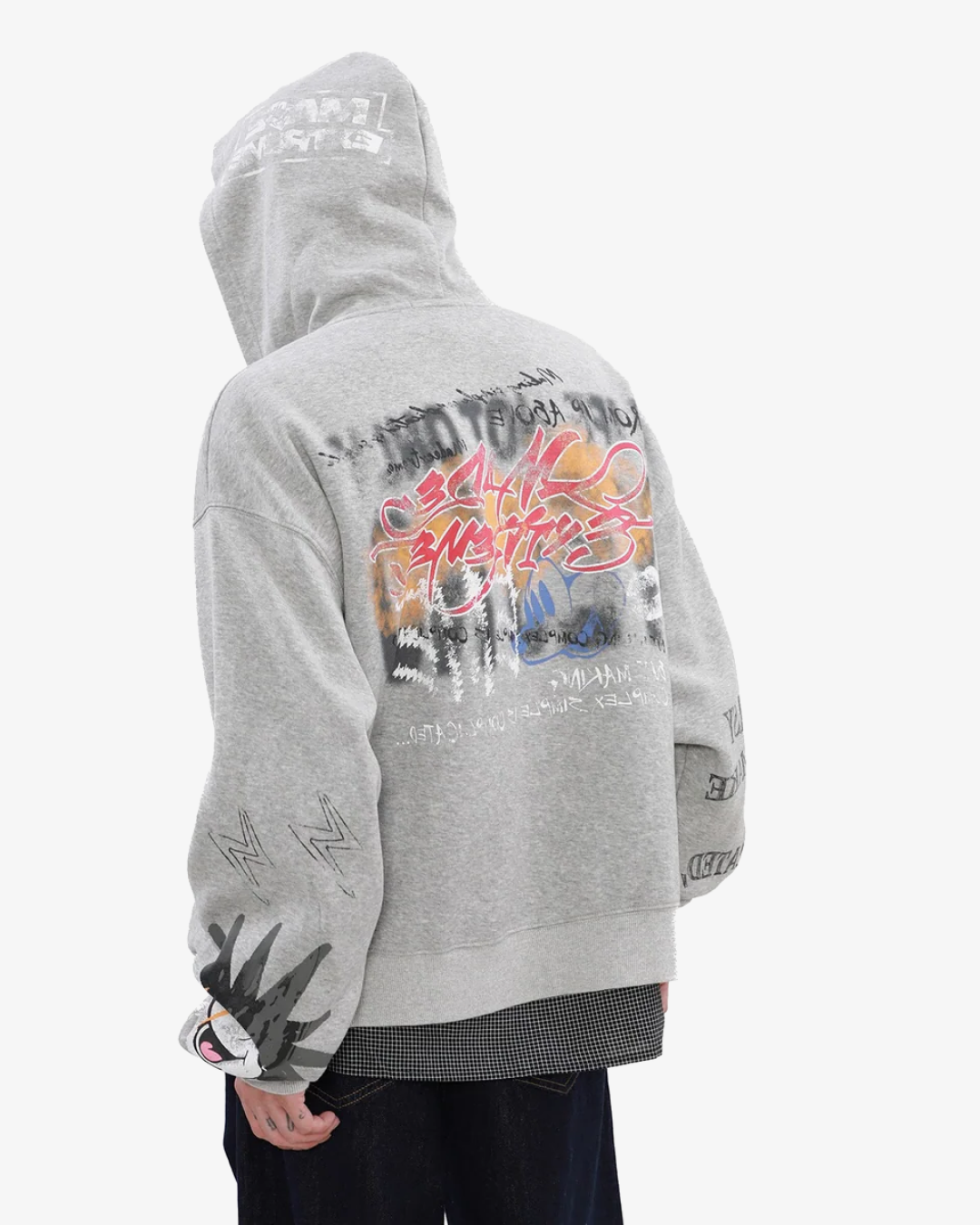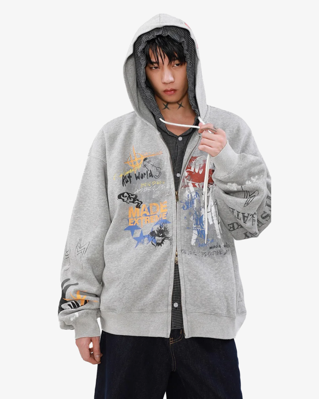 Street Graffiti Print Loose Zip-up Hoodie "Grey"
