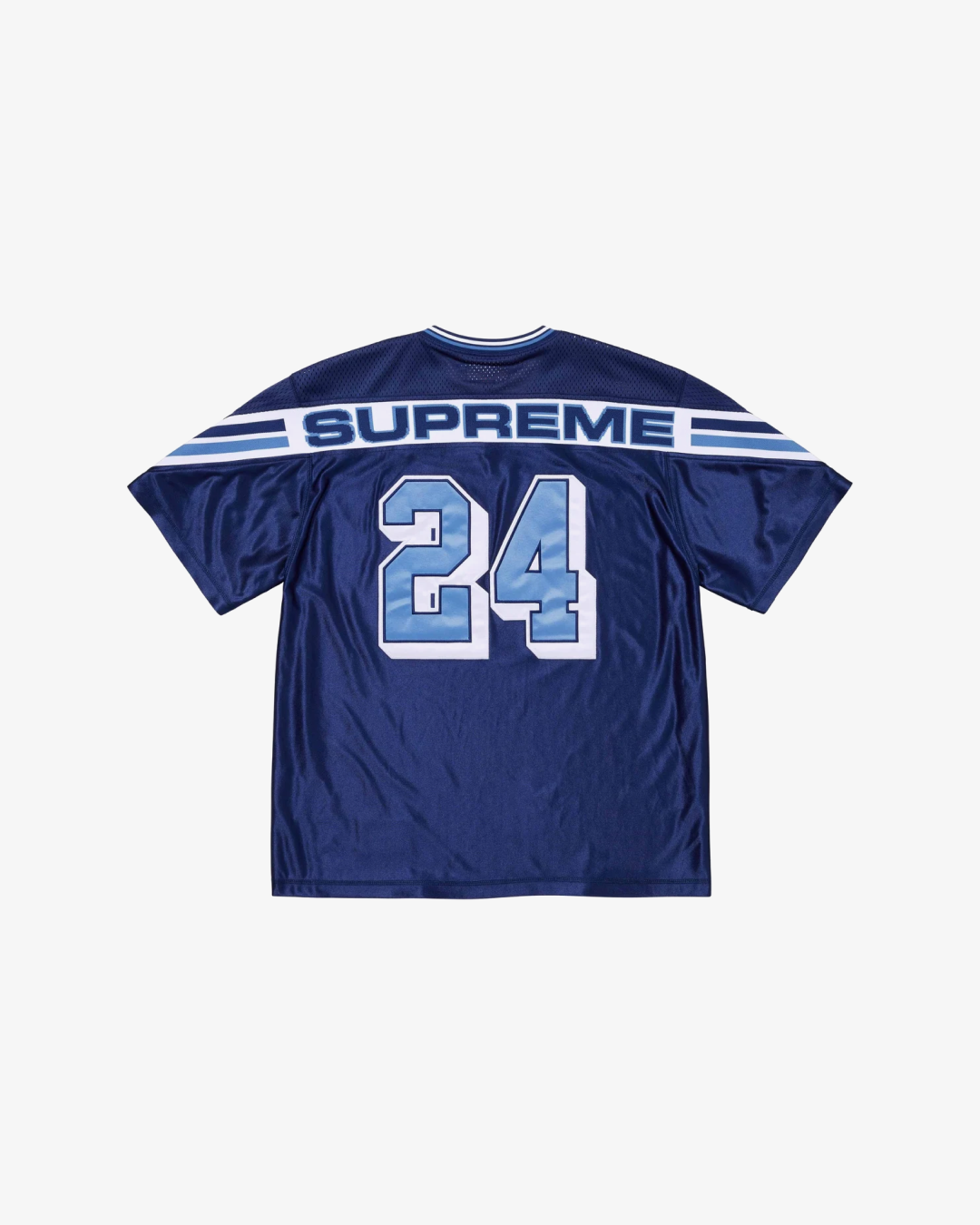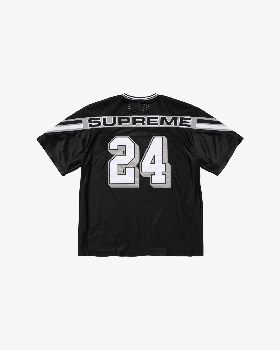 The Supreme Jacquard Rib Football Jersey from the Fall/Winter 2024 collection is a standout piece that merges athletic aesthetics with streetwear flair. Crafted from a combination of poly eyelet mesh and dazzle fabric, this jersey offers both breathability and a subtle sheen. The design features an embroidered Supreme logo on the chest, jacquard knit logo ribbing, and a tackle twill "24" graphic appliqué on the back. An athletic label adorns the lower front, adding to its authentic sportswear appeal.