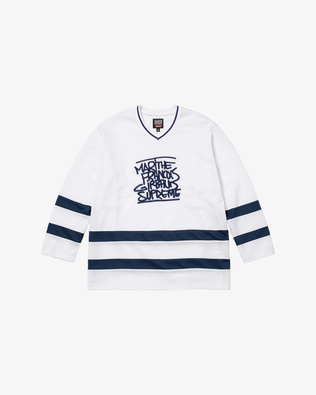 The Supreme x M+FG Hockey Jersey is a standout from the Spring/Summer 2025 collection, bringing together street heritage and experimental French denim innovation Crafted from breathable poly eyelet mesh, this oversized jersey is offered in two bold colorways—Black with contrasting white sleeve stripes, and White featuring red and black accents.