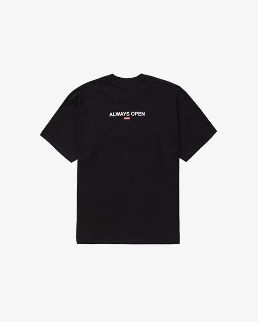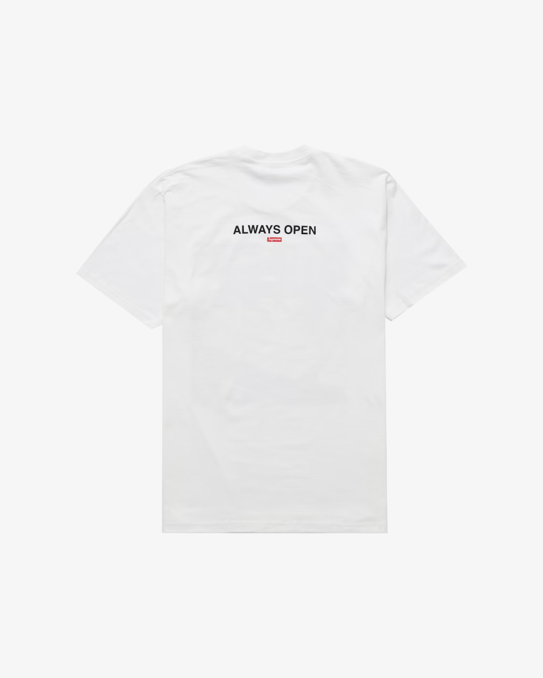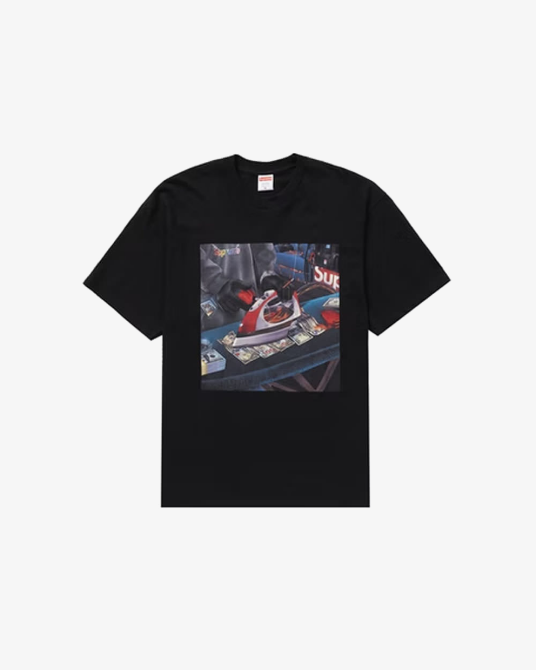 On the front of the tee, there is an illustration of someone pumping gas into an iron and flattening money with the iron. The back of the shirt says "Always Open," and below those words is the iconic red box Supreme logo. The artwork shows someone wearing a Supreme sweatshirt, which cleverly points to the brand. The artist also uses various shades of red and blue, giving it more interest.Â