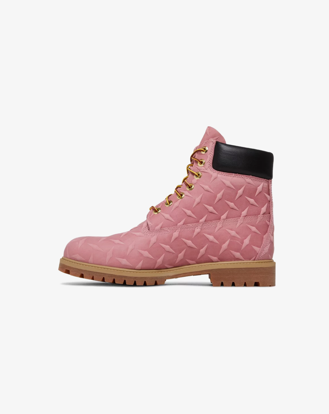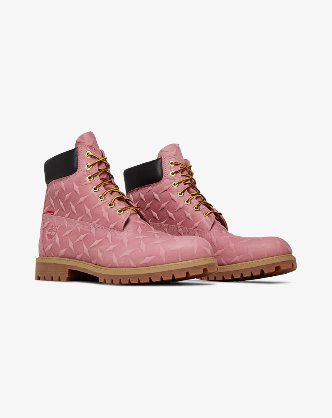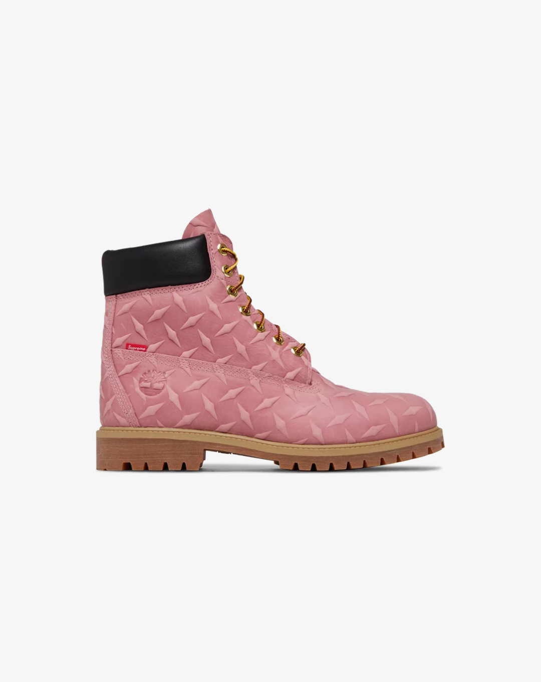 The Supreme x Timberland 6 Inch Premium Waterproof Boot in 'Embossed Diamond Plate - Pink' takes the classic Timberland boot and elevates it with a bold and distinct Supreme flair. This special edition features an embossed diamond plate pattern across the durable premium nubuck leather upper, giving it a rugged, industrial aesthetic with a modern twist.