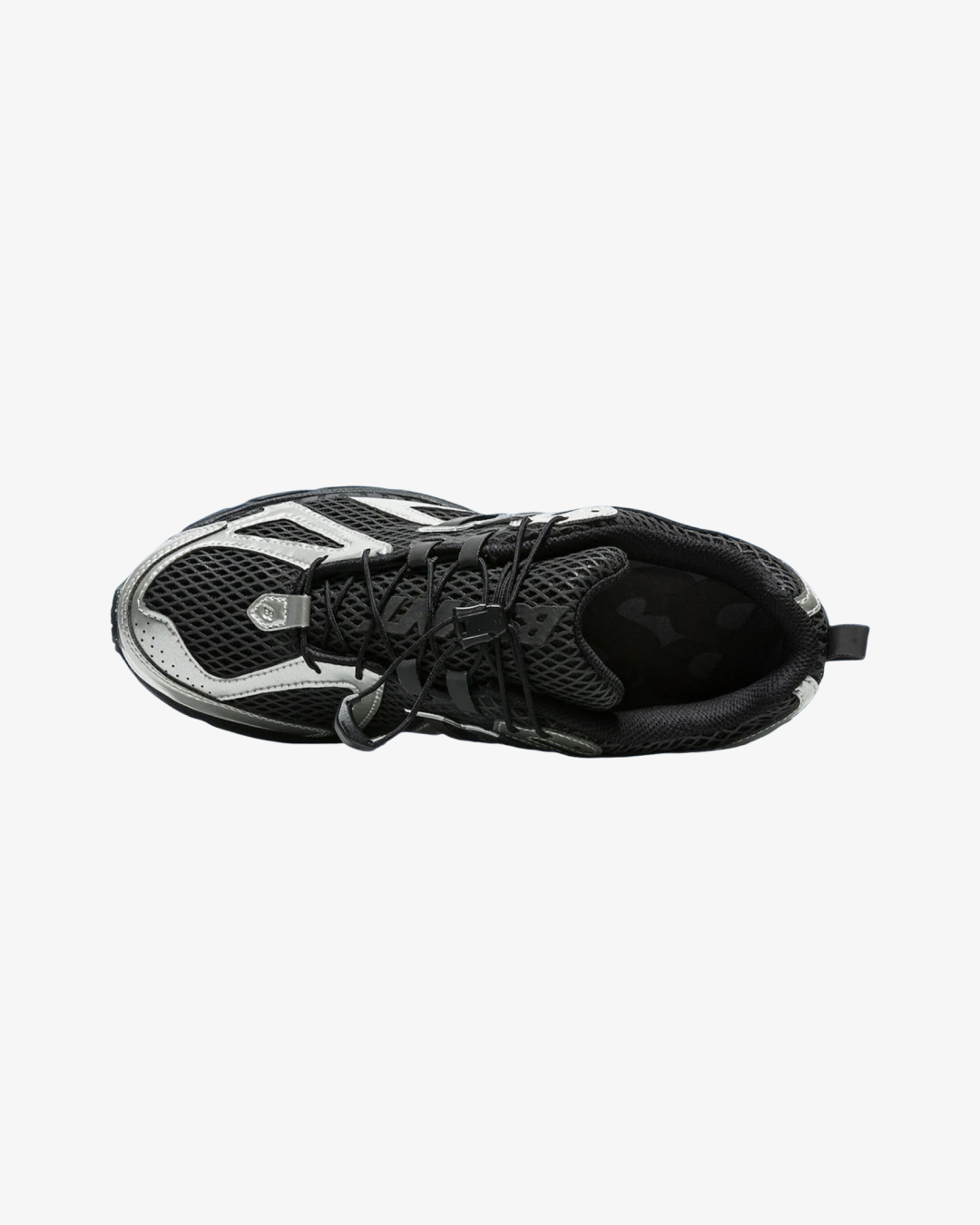 Crafted with a breathable black mesh upper and synthetic leather overlays, the sneaker features a molded TPU heel cage in metallic silver. Reflective accents and durable mesh enhance visibility and comfort. Branding elements include a black 'N' logo and 'BSMNT' debossed on the lateral forefoot. The sneaker rides on a solid black ACTEVA LITE midsole with ABZORB SBS heel cushioning, ensuring superior comfort and support. citeturn0search1