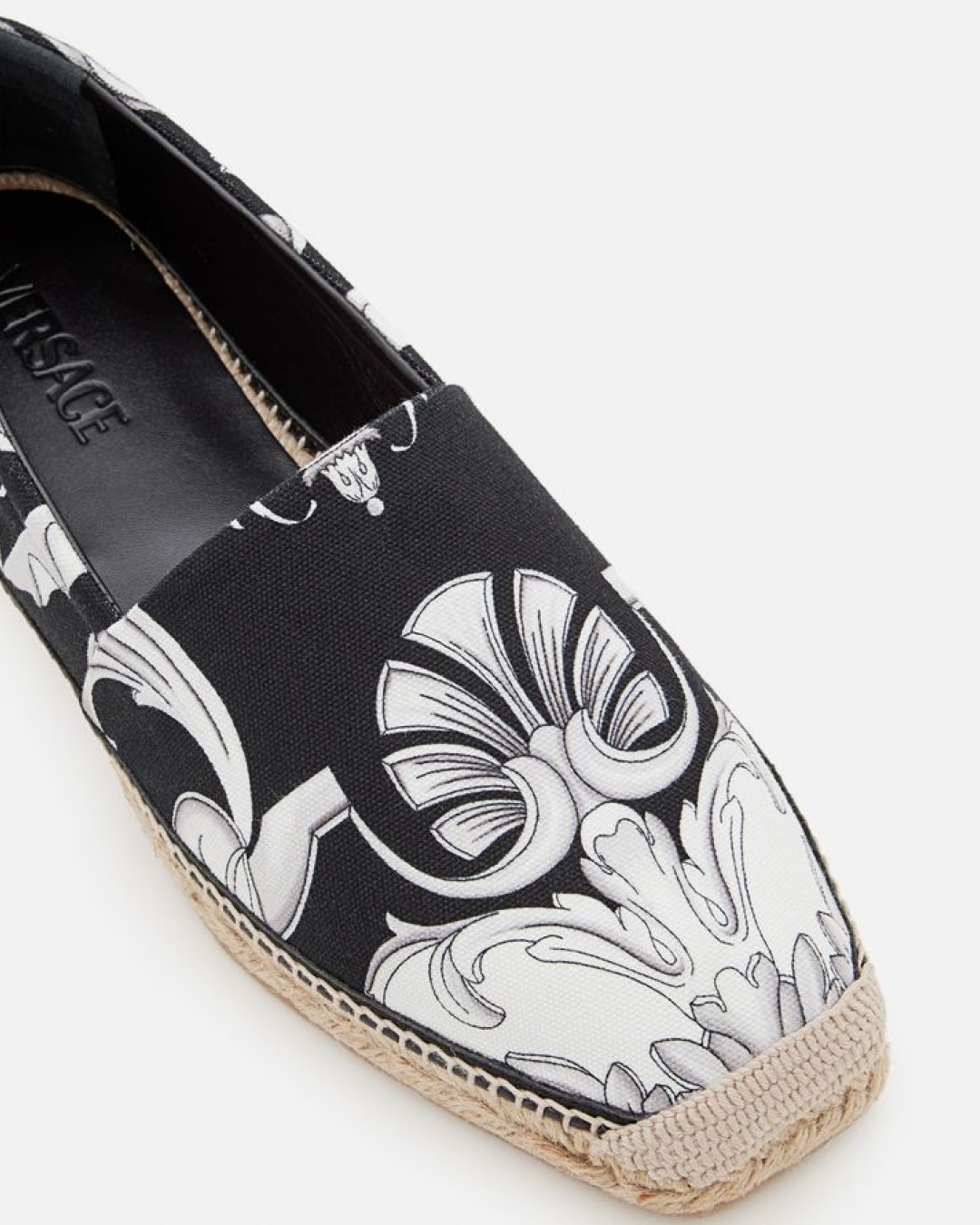 The Versace Baroque Espadrille in White & Black exudes the opulent flair synonymous with the Versace brand. These luxurious espadrilles feature the iconic Baroque print in a striking white and black color combination, offering a bold yet elegant aesthetic. The upper is crafted from premium canvas, adorned with the intricate Baroque pattern, adding a touch of classic Versace style to the design.
