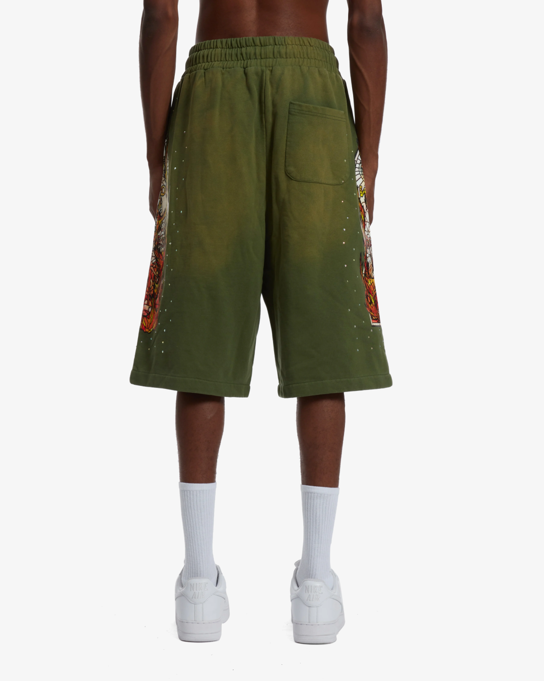 Who Decides War Sweat Shorts in Green offer a fresh, bold take on casual streetwear. The green color adds a vibrant and earthy touch to the already striking design, making them a standout piece in any wardrobe. Just like the other designs from the brand, these shorts are likely crafted from high-quality materials like cotton fleece for ultimate comfort and durability.